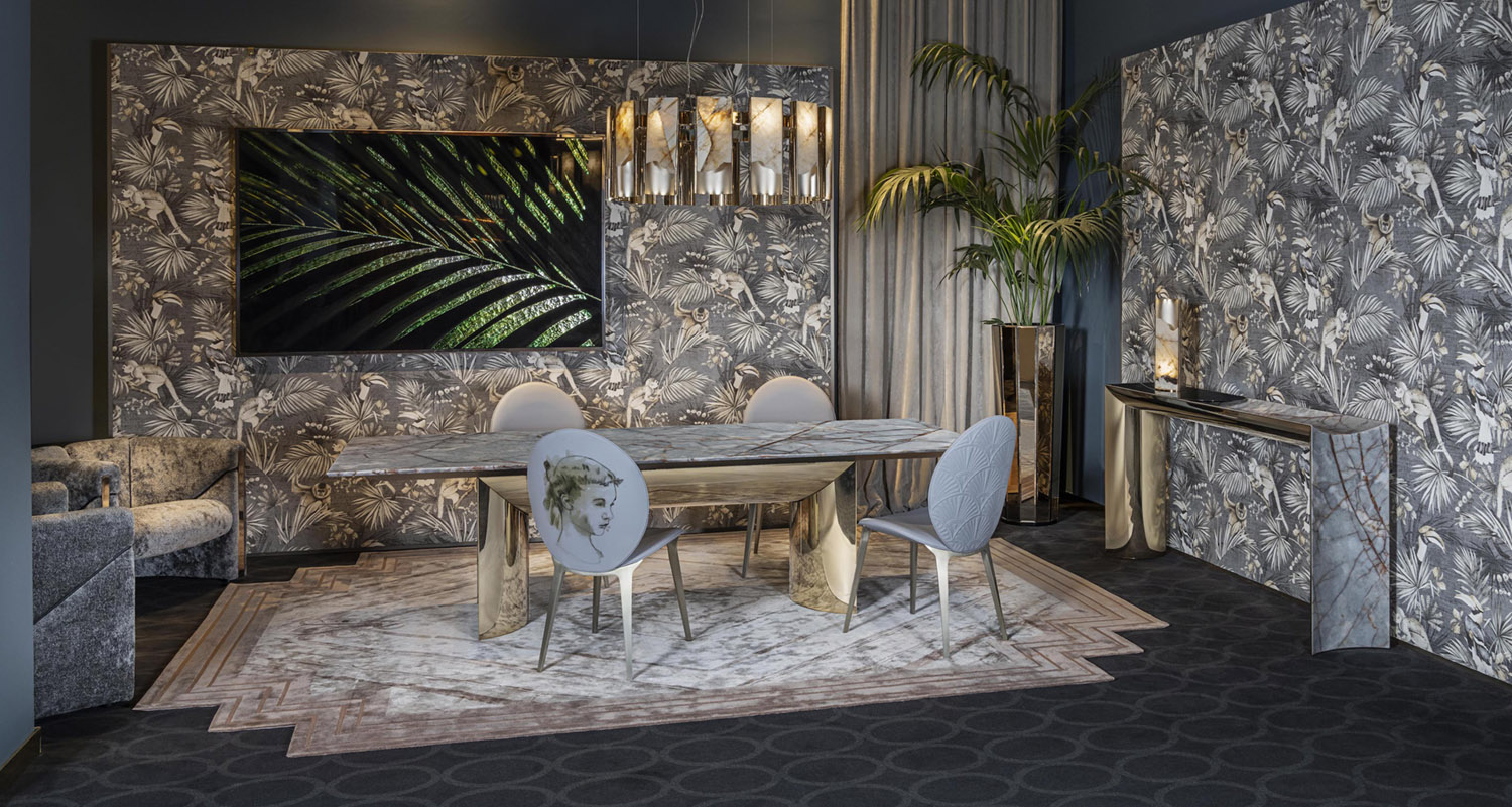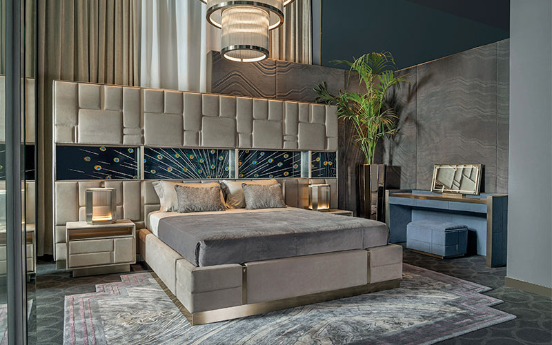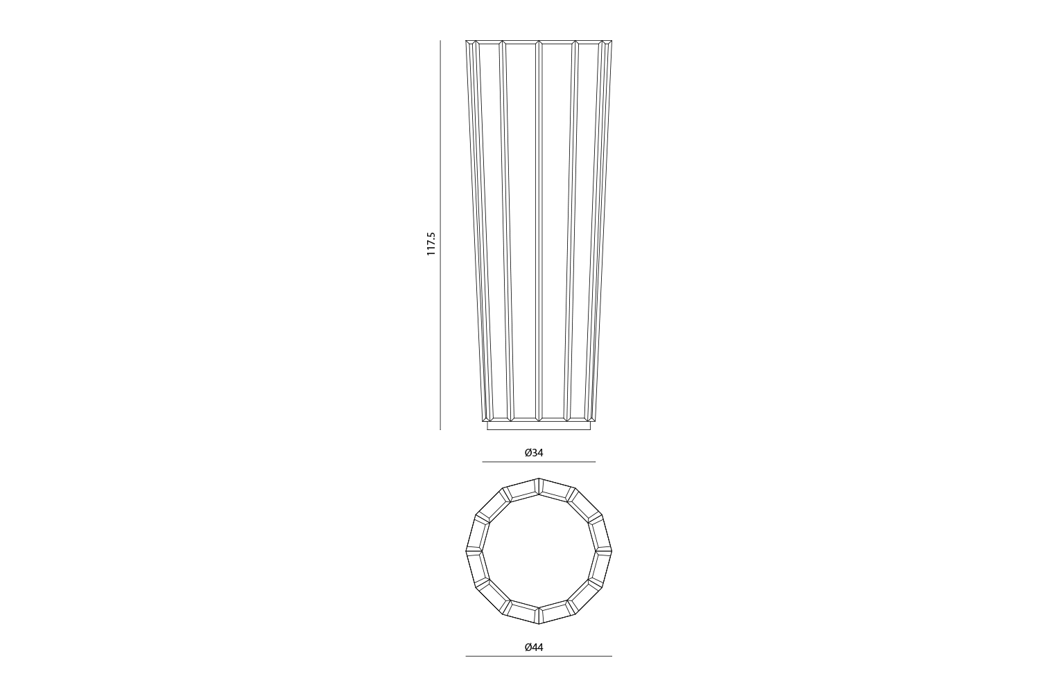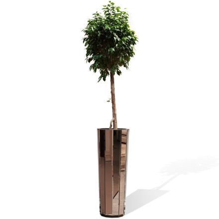 Planter with “diamond” design in MDF, coated in sections of bronze or smoked mirror, bevelled individually. Internal part with matt finishings, internal shelf for pot. Plinth in MDF lacquered in glossy black.