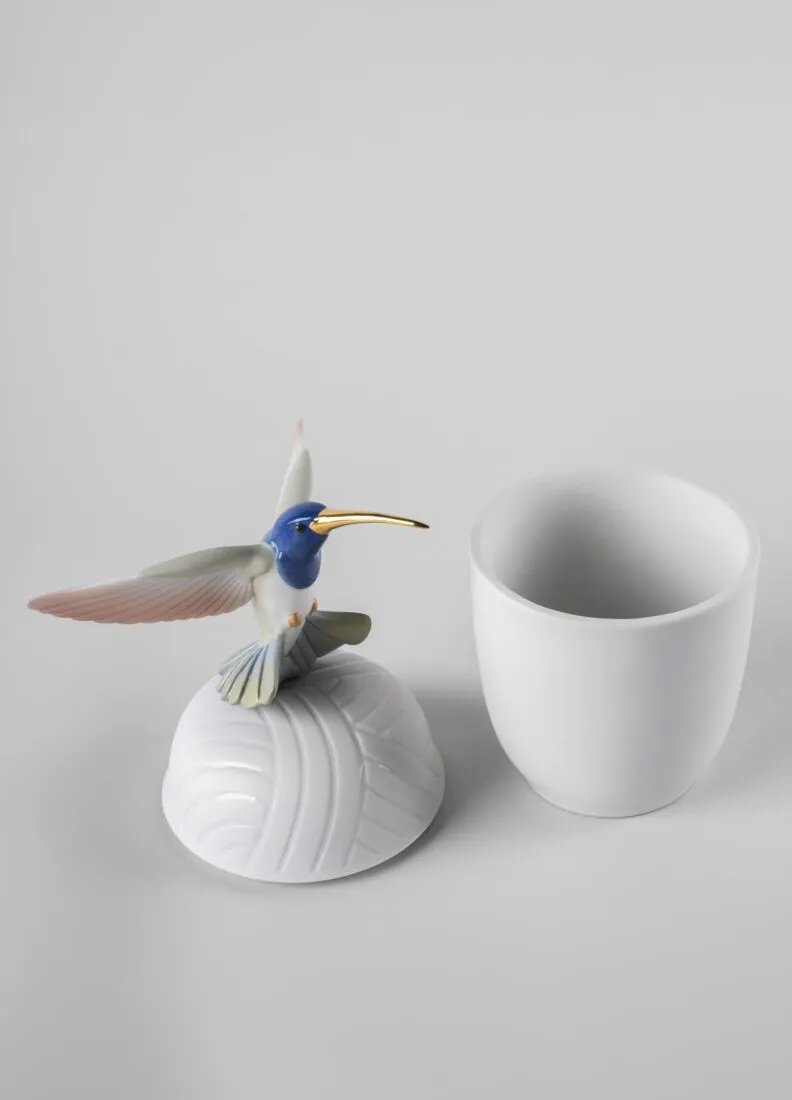 Porcelain box with a beautiful hummingbird. These functional objects are ornamented with beautiful creatures from tropical rainforests. In Hummingbird Box the wealth of coloring of the bird contrasts with the matte holder and the varnished details underscoring etching on the lid. It is decorated with lusters and with metallic, iridescent pigments in a wide spectrum of colors. The refined treatment of the boxes and the exquisite detail of the hummingbird are matched and combined in a perfect play of contrasts. " This piece has insurance included. Weight: 1.85 kg Finished: Satin matte