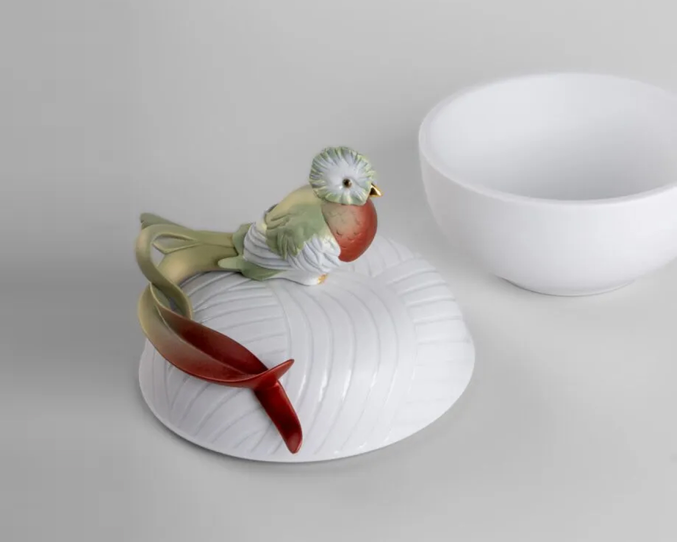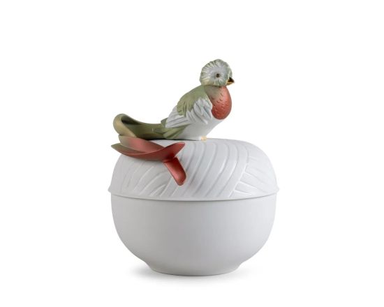 "These functional objects are ornamented with beautiful creatures from tropical rainforests. In Quetzal Box the wealth of coloring of the bird contrasts with the matte holder and the varnished details underscoring etching on the lid. It is decorated with lusters and with metallic, iridescent pigments in a wide spectrum of colors. The refined treatment of the boxes and the exquisite detail of the quetzal are matched and combined in a perfect play of contrasts. " This piece has insurance included Weight: 3.65 kg Finished: Satin matte