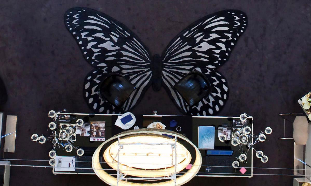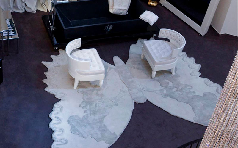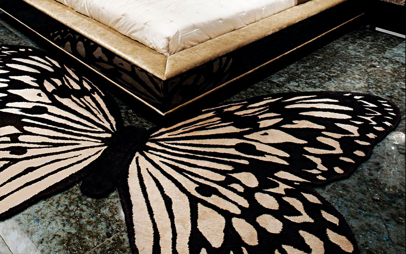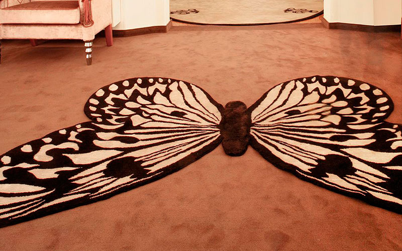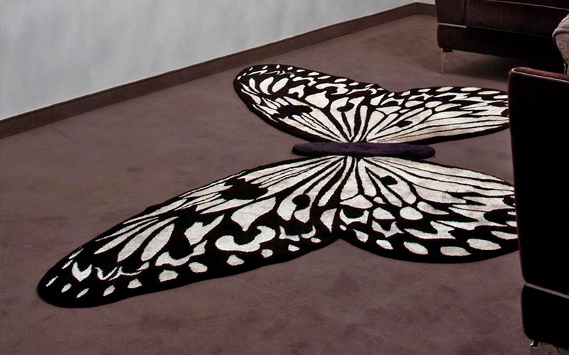 Butterfly shaped carpet made in silk and Tibetan wool knotted by hand. Body of butterfly in black, wings in white and black. Available in two sizes.