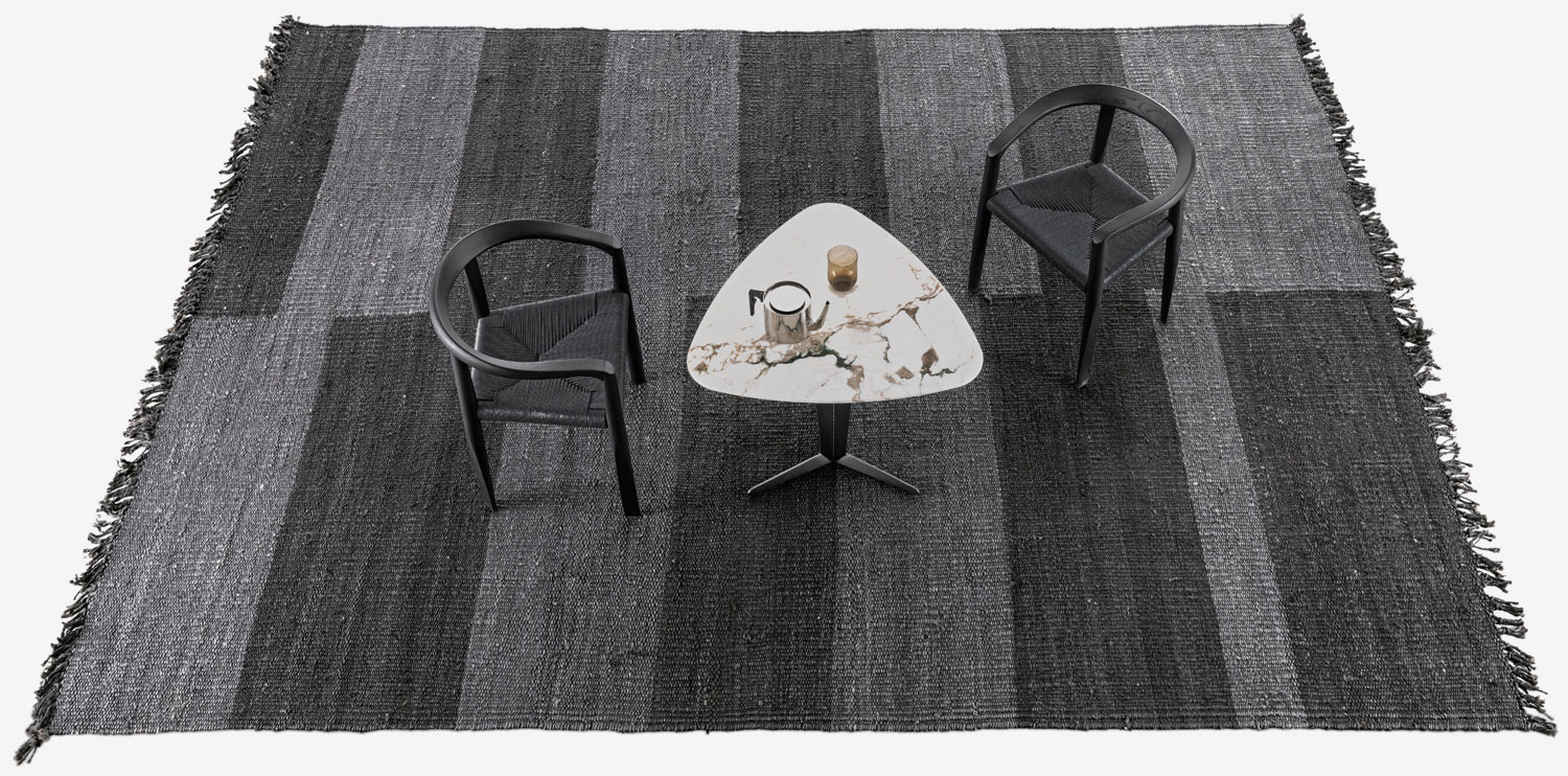 Natural hemp fibres, hand woven according to ancient carpet weaving techniques, feature geometric surfaces of simple and elegant modernity.