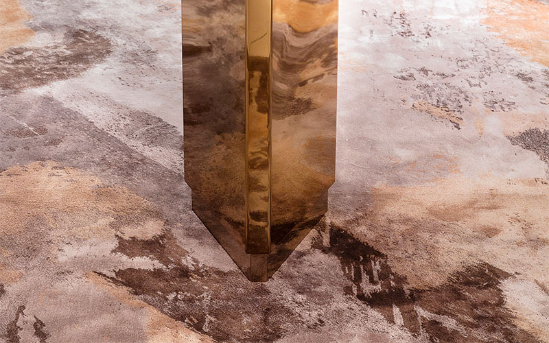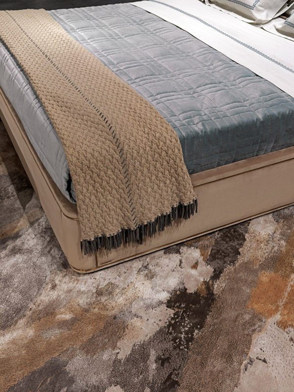 Hand-tufted carpet inbamboo silk and New Zealand wool with carving work. Cotton backing.