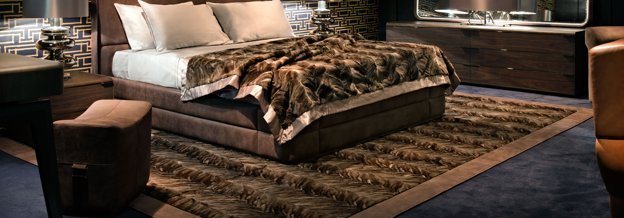 Carpet made of natural red fox around the perimeter of the bed with edging on the edge.