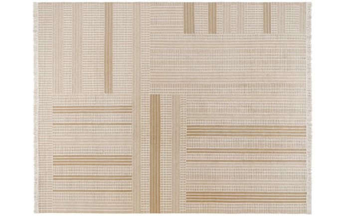 Telaro is a rug featuring a geometric motif and a linear pattern. A series of spaces arranged regularly with each other, featuring different sizes and orientations which thus define a contrasting grid.
