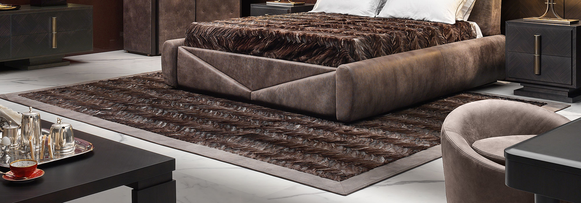 Natural silver fox rug for the bed perimeter with leather edge fold