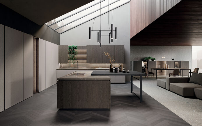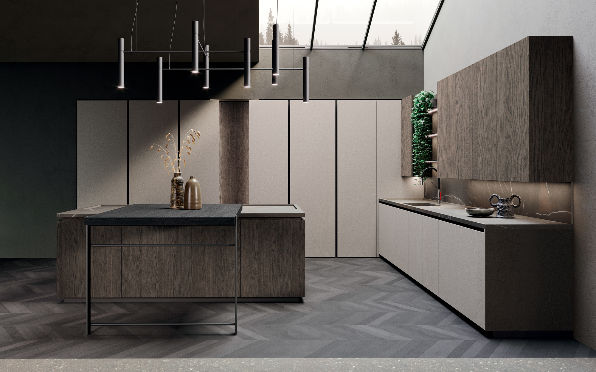 At the center of this project is the idea of a space for socializing: a square island dominates the interior. The square shape symbolizes convenience, creating an element around which you can move and spend time in comfort. This island also includes a plane for snacks, increasing the possibilities for meetings and socializing. Columns and wall blocks that protrude 15 cm from the door structure interrupt the monotony of the facades and provide a comfortable grip for opening. Empty areas add interest and create libraries or cones of light. The materials used have a classic style: bilaminate Pietra Piasentina is combined with oak wood Rovere Grigio Londra. The setting is completed by a living wall reflecting the materials of the kitchen, complemented by Reflex wall cabinets that add light and create dynamics with their stepped plans. In the background are a table and low columns
