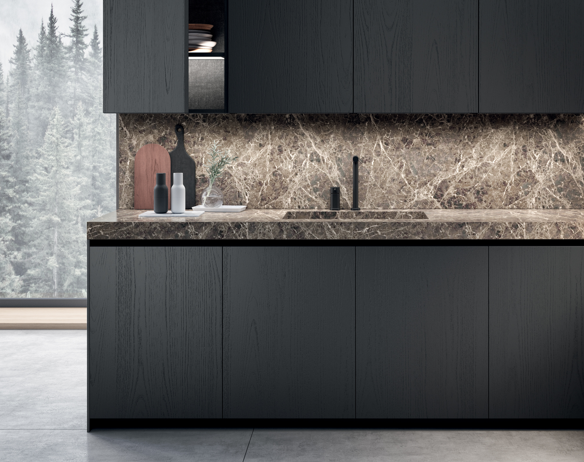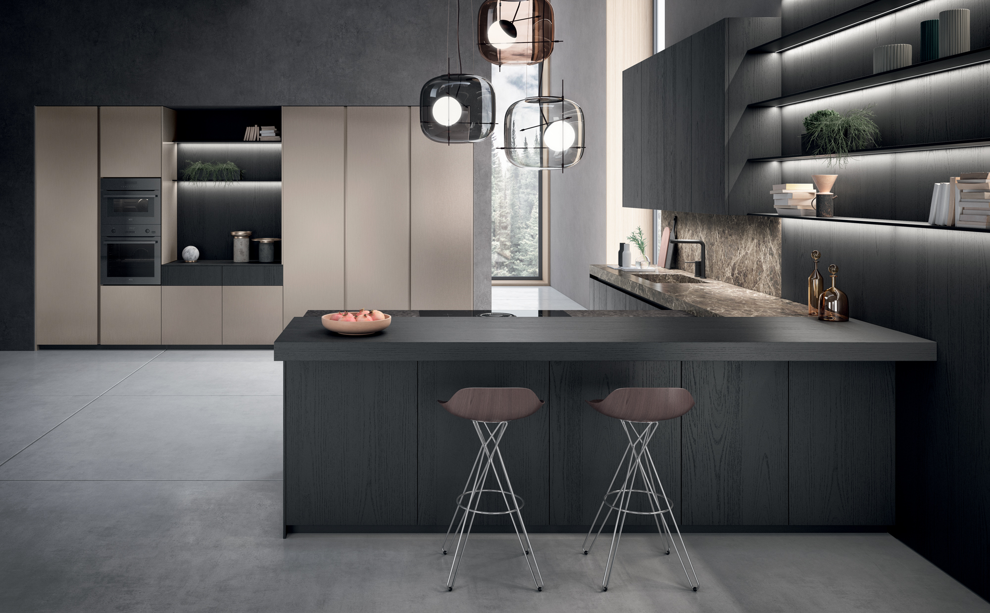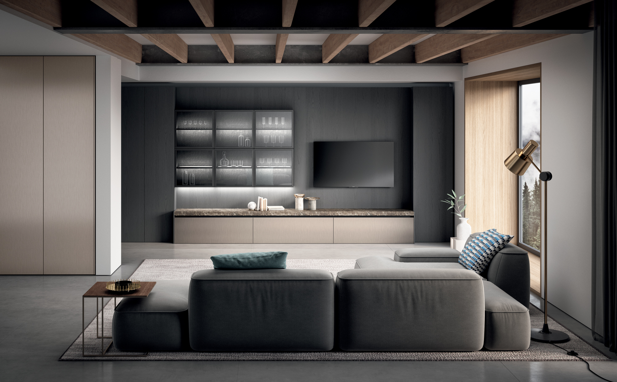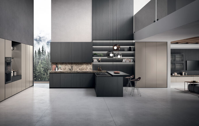 A project that allows to rediscover the pleasure of living a rich and warm kitchen environment. A truly professionally inspired laboratory with all the accessories and equipment useful for the preparation of food, as well as details of a refi ned decorative product which further enlarges the already vast offer of exclusive worktops on the part of Binova. The matericity of natural wood for a pleasant aesthetic and tactile sensation, column doors in tech aluminum finish are matched with base and wall units in oak wood Rovere carbone finish, a set of high-tech materials, which contribute to creating a unique product of its kind. A large peninsula acts as a watershed between the column area and the living area. The whole project is centered on the theme of specular openings, if the kitchen has a central wooden boiserie, the columns have a central compartment suitable for containment of small appliances and finally the living wall show at the center glass units and wooden back panels.
