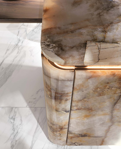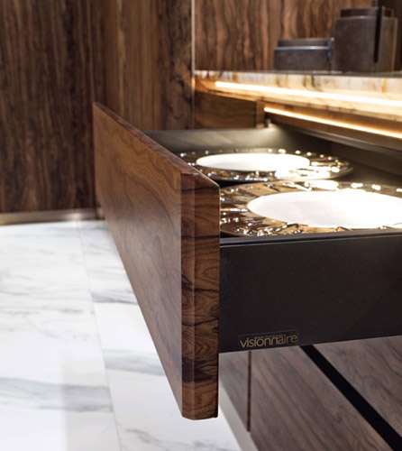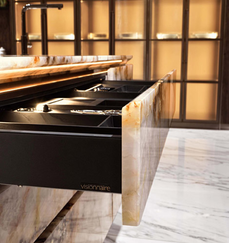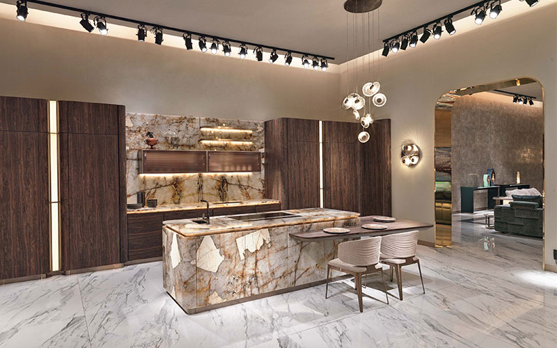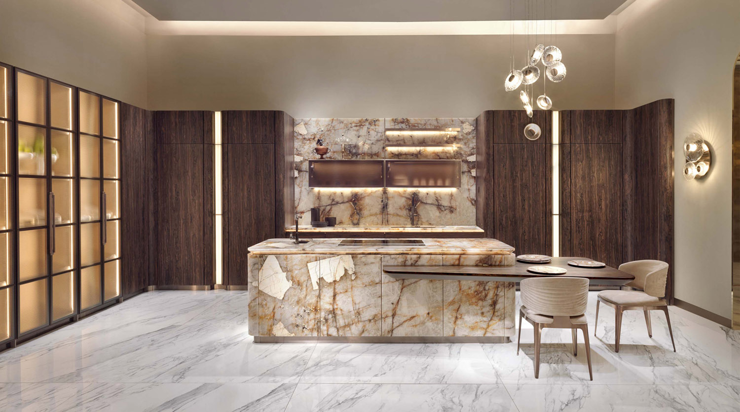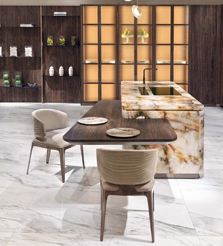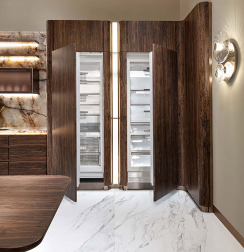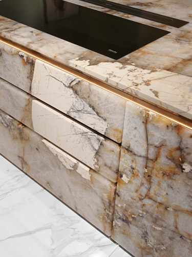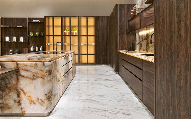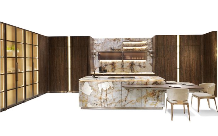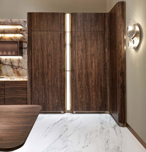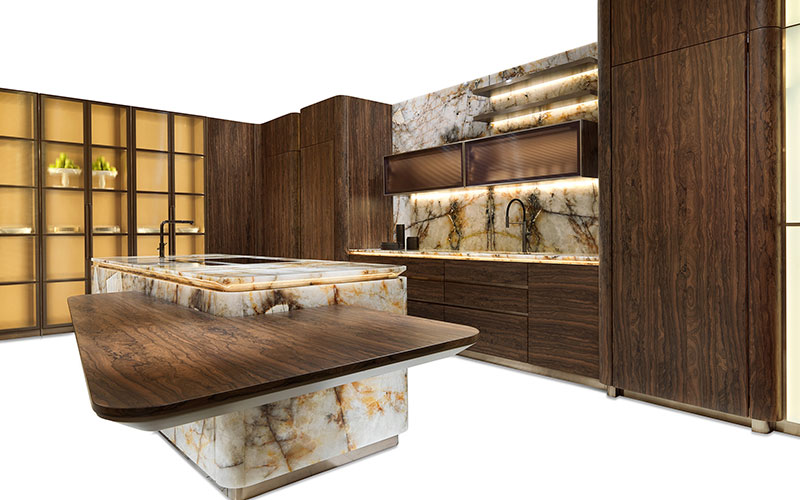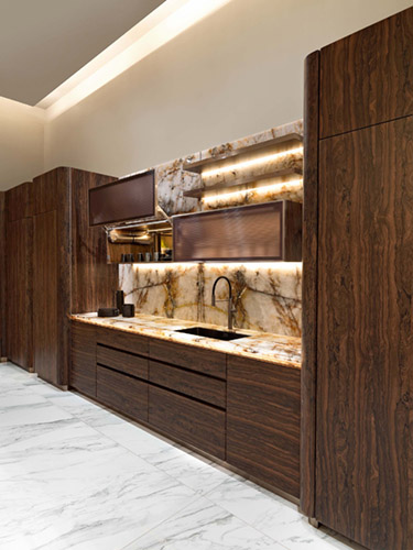 Marble and wood kitchen. Wall-mounted modules: tall units equipped with shelves or predisposed for refrigeration or cooking appliances.