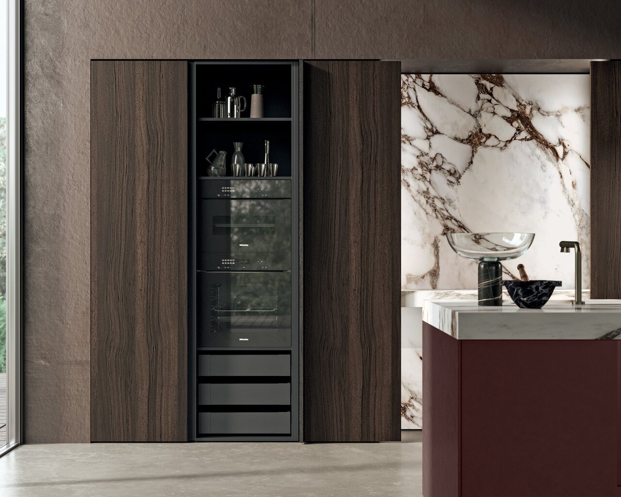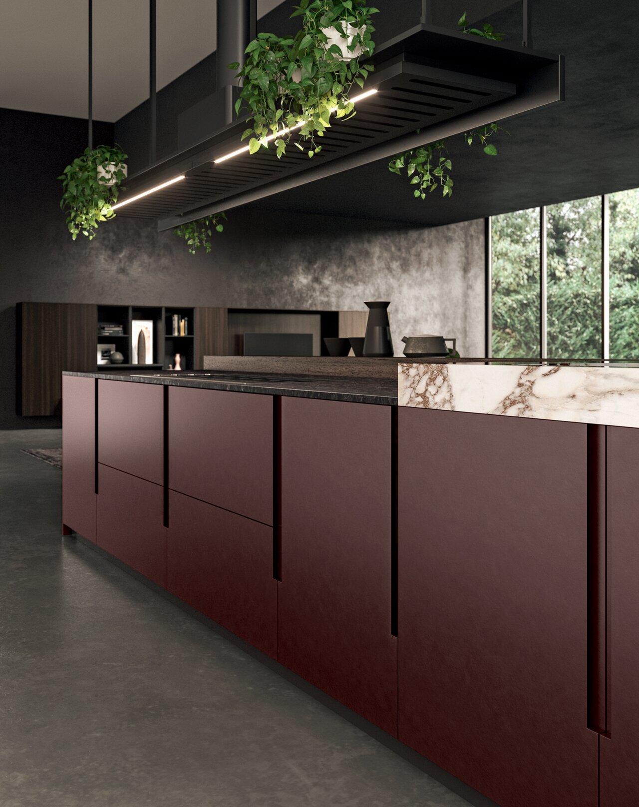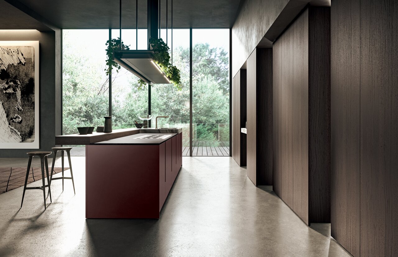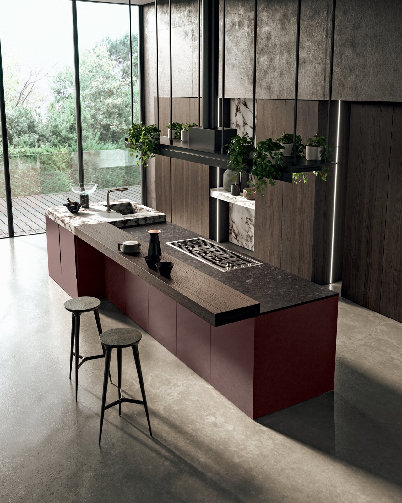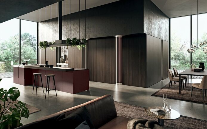 Binova proposes a new project that defines the spirit of an open house that is no longer afraid of informal looks, where the perception of space changes, no longer being an extravagance. The main element around which the whole room revolves is the L-shaped wall-column, composed of modules of different depths connected in a single line that connects the kitchen to the living room and uses the same elements, a "continuum" of contamination of forms and functions. Another strong feature of the columns are the openings that ease the impact of the wooden wall and at the same time allow the opening of facades and beautiful light cones. The island with Vogue doors is characterized by vertical slots that allow opening and a lacquered 4.0 metal finish. Another innovative element is the cantilevered table top, which guarantees a comfortable area for socializing. The living wall has the same finish as the kitchen and is characterized by intersecting volumes that allow the creation of full and empty spaces with built-in open modules, while the sideboard has Vogue doors and a thick gres countertop.