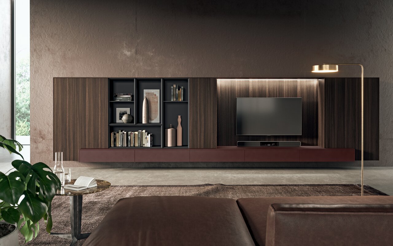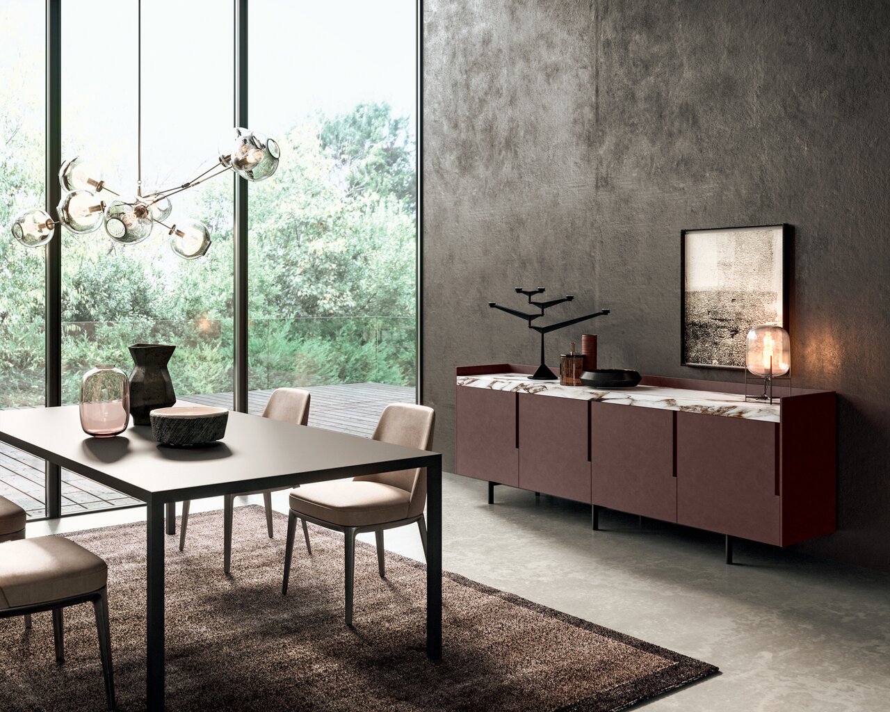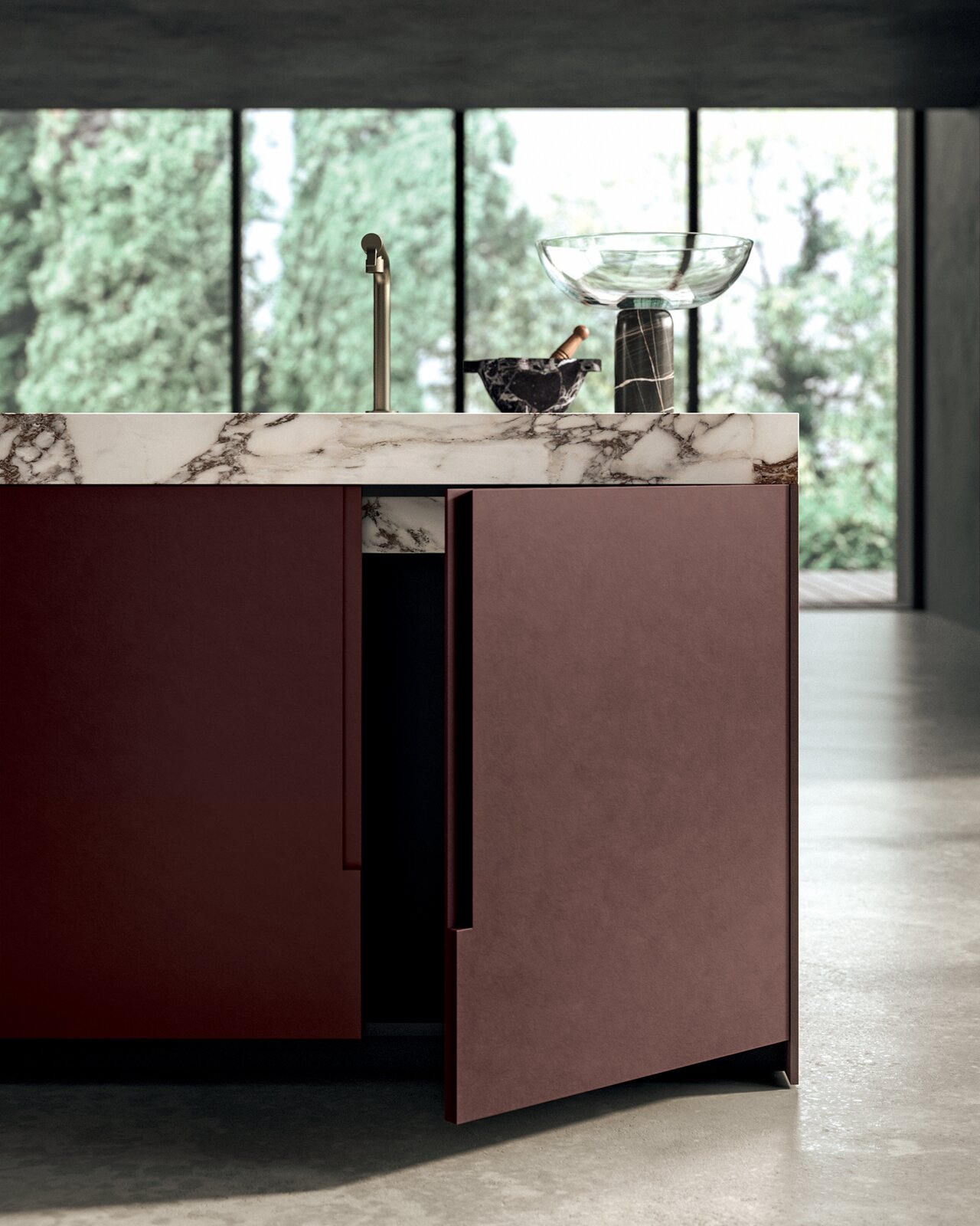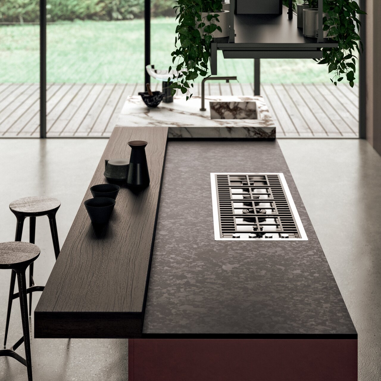 Binova proposes a new project that defines the spirit of an open house that is no longer afraid of informal looks, where the perception of space changes, no longer being an extravagance. The main element around which the whole room revolves is the L-shaped wall-column, composed of modules of different depths connected in a single line that connects the kitchen to the living room and uses the same elements, a "continuum" of contamination of forms and functions. Another strong feature of the columns are the openings that ease the impact of the wooden wall and at the same time allow the opening of facades and beautiful light cones. The island with Vogue doors is characterized by vertical slots that allow opening and a lacquered 4.0 metal finish. Another innovative element is the cantilevered table top, which guarantees a comfortable area for socializing. The living wall has the same finish as the kitchen and is characterized by intersecting volumes that allow the creation of full and empty spaces with built-in open modules, while the sideboard has Vogue doors and a thick gres countertop.