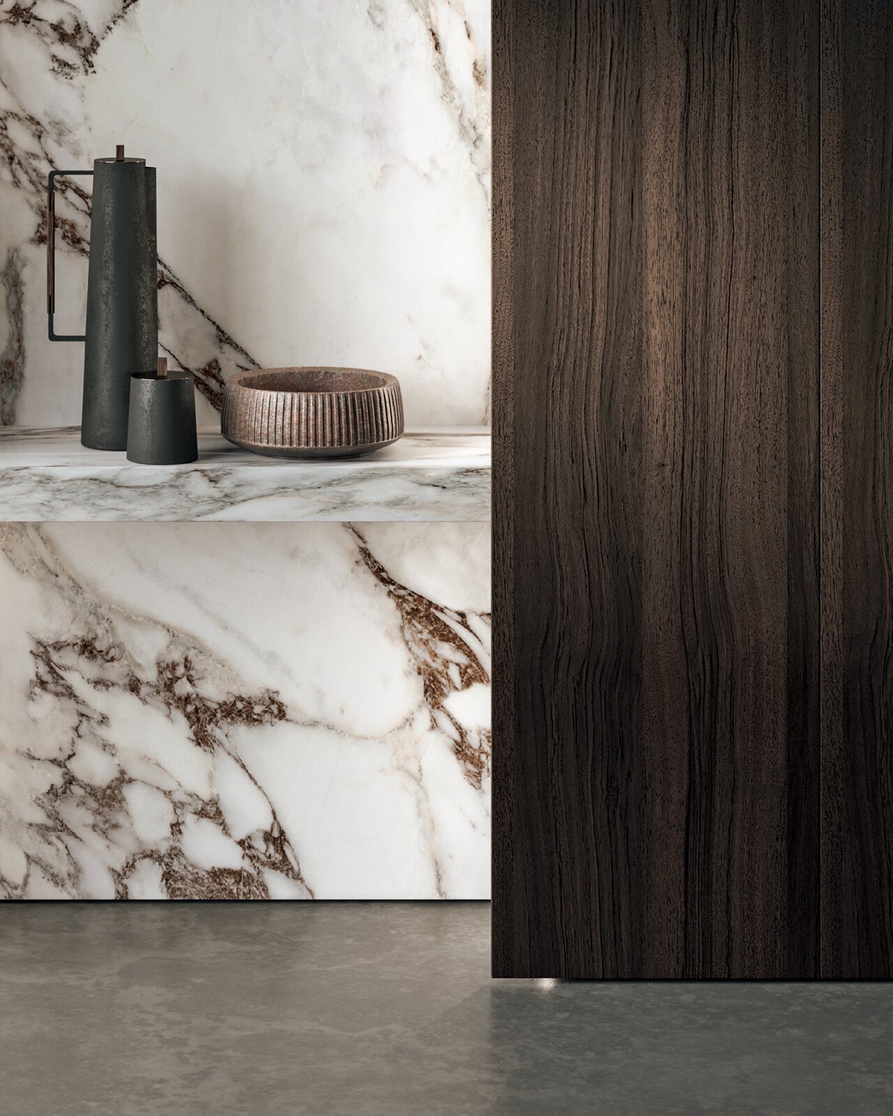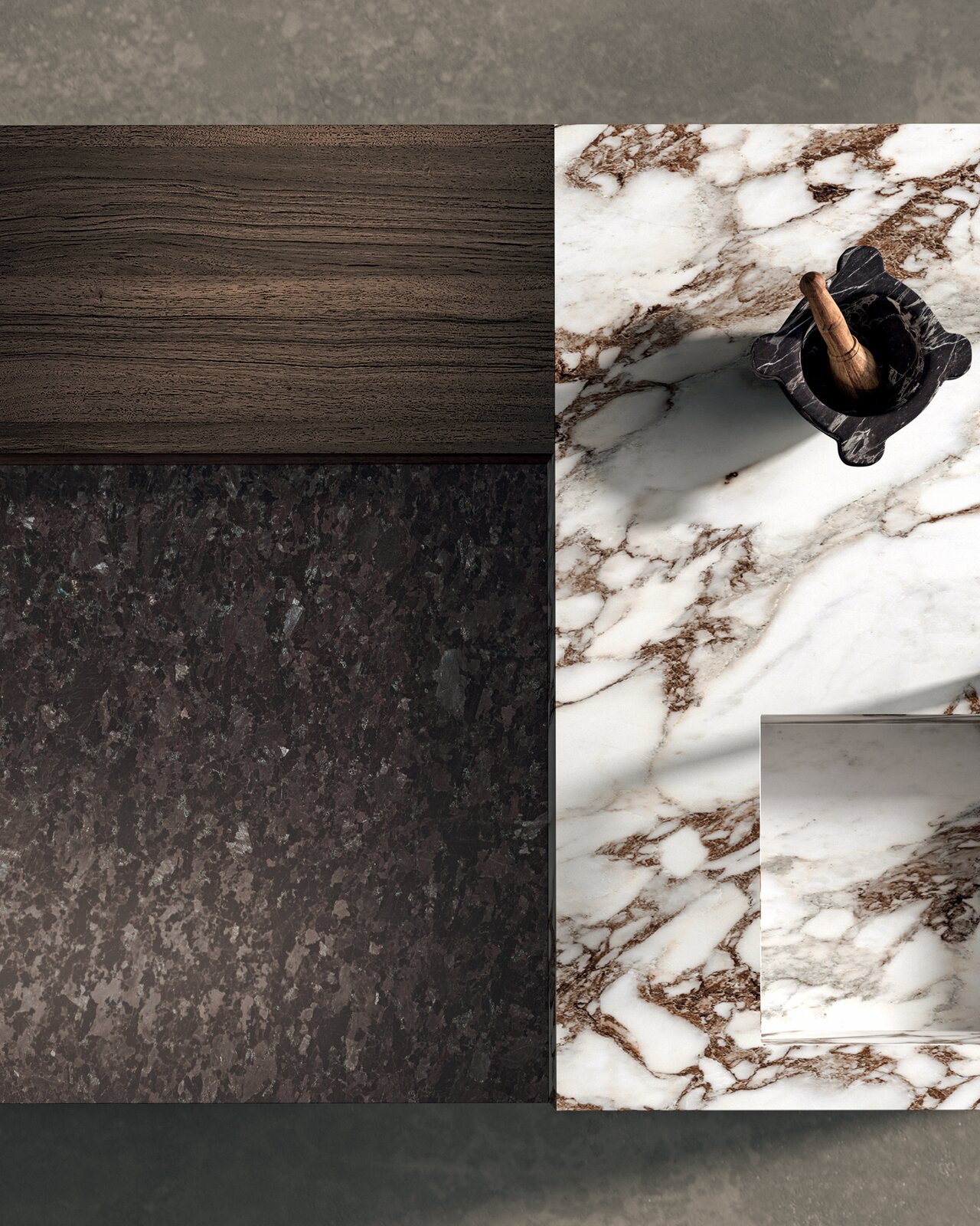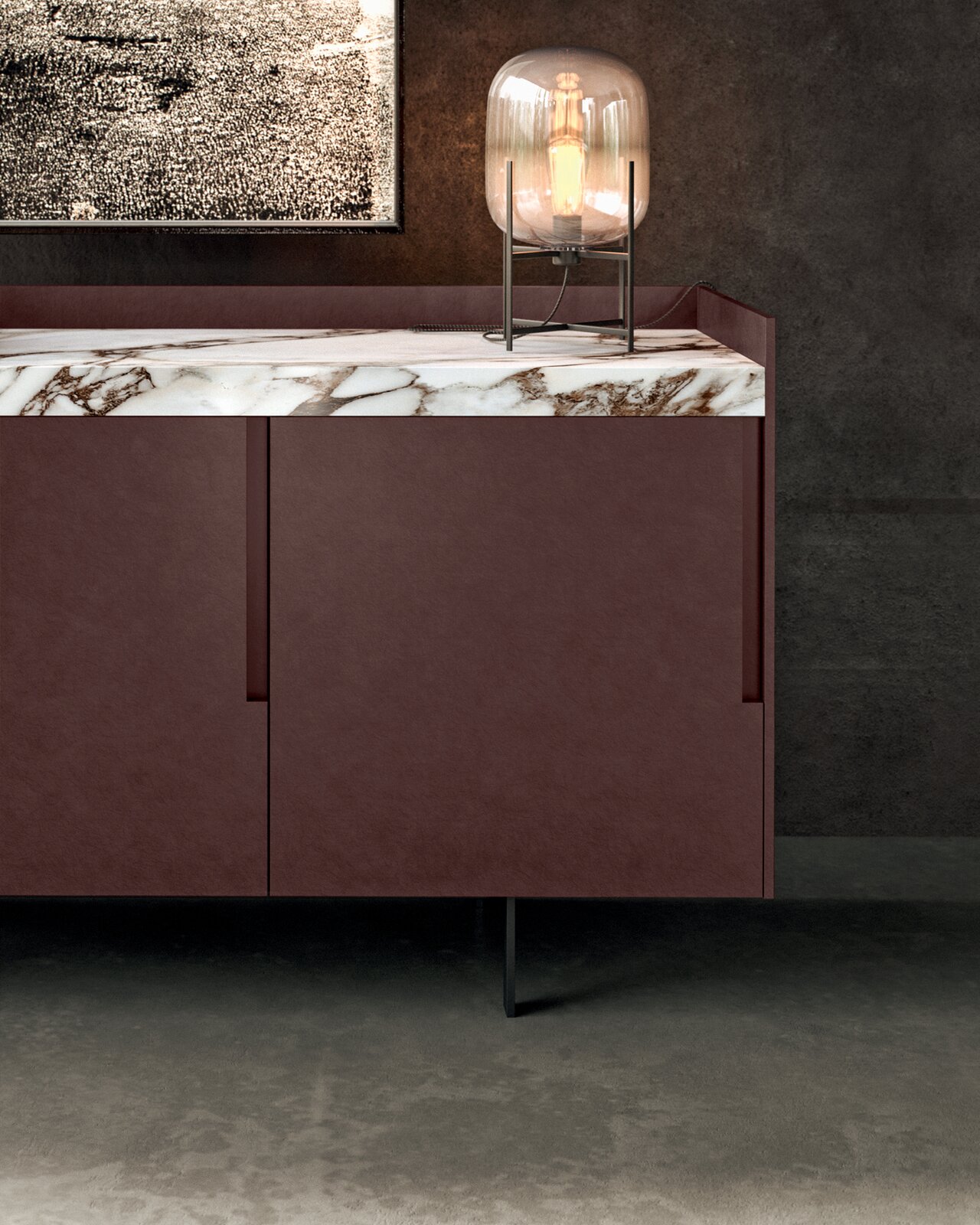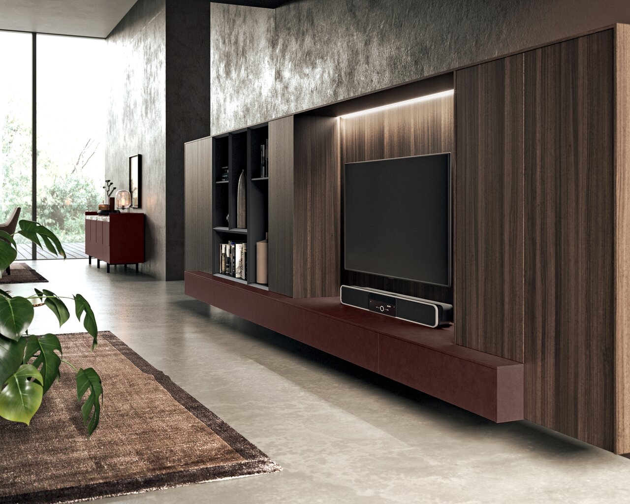 Binova proposes a new project that defines the spirit of an open house that is no longer afraid of informal looks, where the perception of space changes, no longer being an extravagance. The main element around which the whole room revolves is the L-shaped wall-column, composed of modules of different depths connected in a single line that connects the kitchen to the living room and uses the same elements, a "continuum" of contamination of forms and functions. Another strong feature of the columns are the openings that ease the impact of the wooden wall and at the same time allow the opening of facades and beautiful light cones. The island with Vogue doors is characterized by vertical slots that allow opening and a lacquered 4.0 metal finish. Another innovative element is the cantilevered table top, which guarantees a comfortable area for socializing. The living wall has the same finish as the kitchen and is characterized by intersecting volumes that allow the creation of full and empty spaces with built-in open modules, while the sideboard has Vogue doors and a thick gres countertop.
