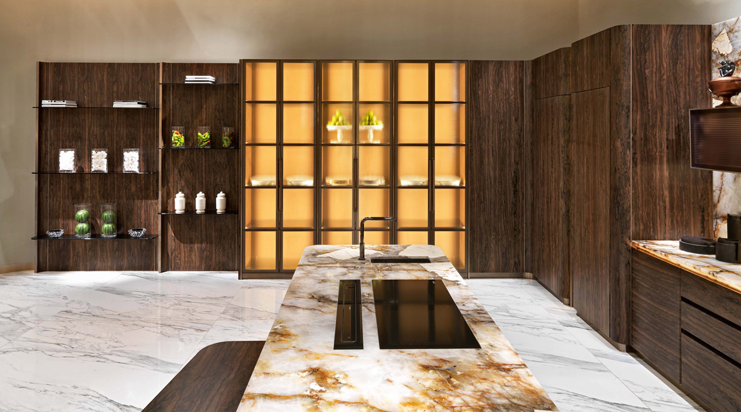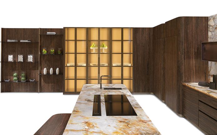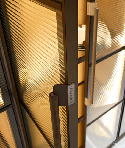 Showcase with wooden furniture covered internally with leather or fabric, with aluminium doors and horizontal ribbed glass. The doors and internal shelves have a drawn, powder-coated aluminium frame and glass panels.