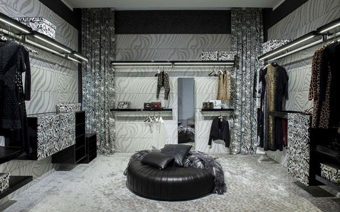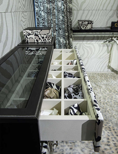 Custom-made modular walk in closet with structure in multilayer wood. Back panel covered in fabric. All elements are available in glossy lacquered finishing. Optional covering of drawers front in fabric or leather from the collection. Hanging bars in metal.
