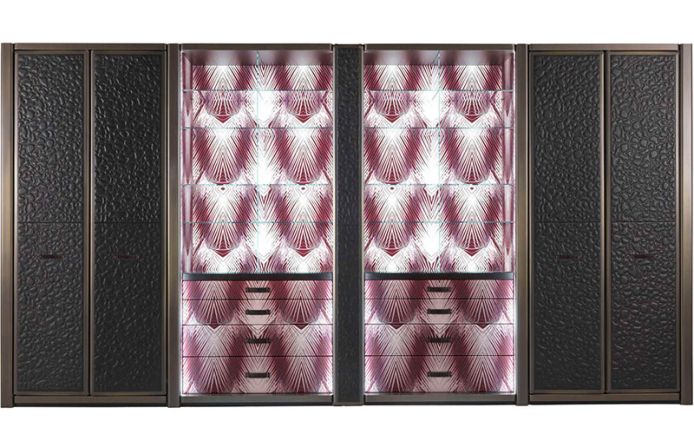 Custom-made modular walk in closet with structure in multilayer wood. Available in all the fabrics, leathers and wooden finishings from the collection. LED bars on each lateral panel included.