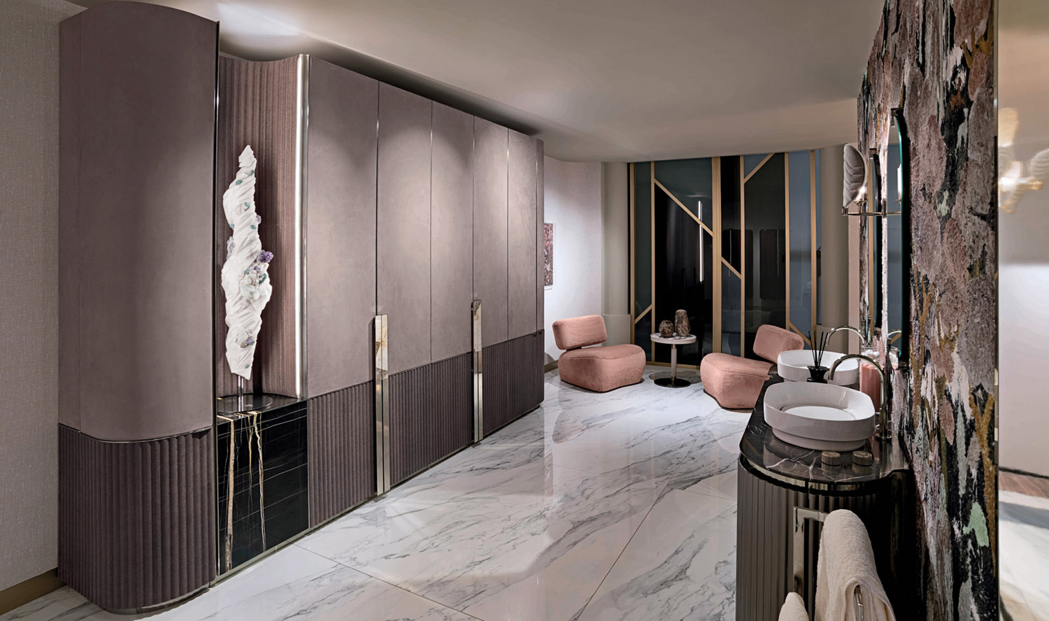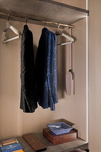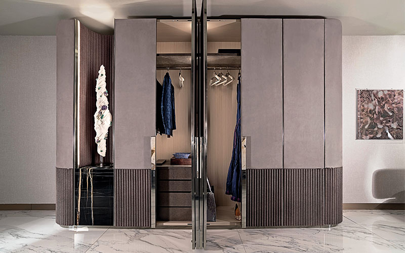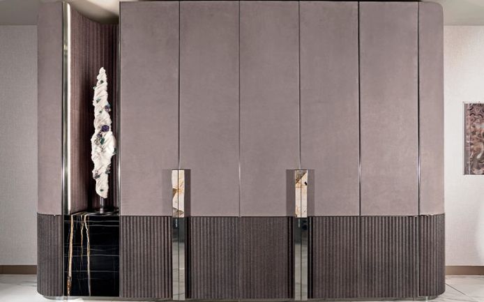 Wardrobe in wood and leather. Doors in double finish with bottom panels decorated with ‘canneté’ stripes carved in low relief, upholstered in leather or available with shiny lacquer RAL colours. Plain upper panels covered with contrast leather, edges with profiles in satin aluminium.