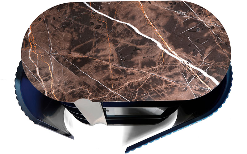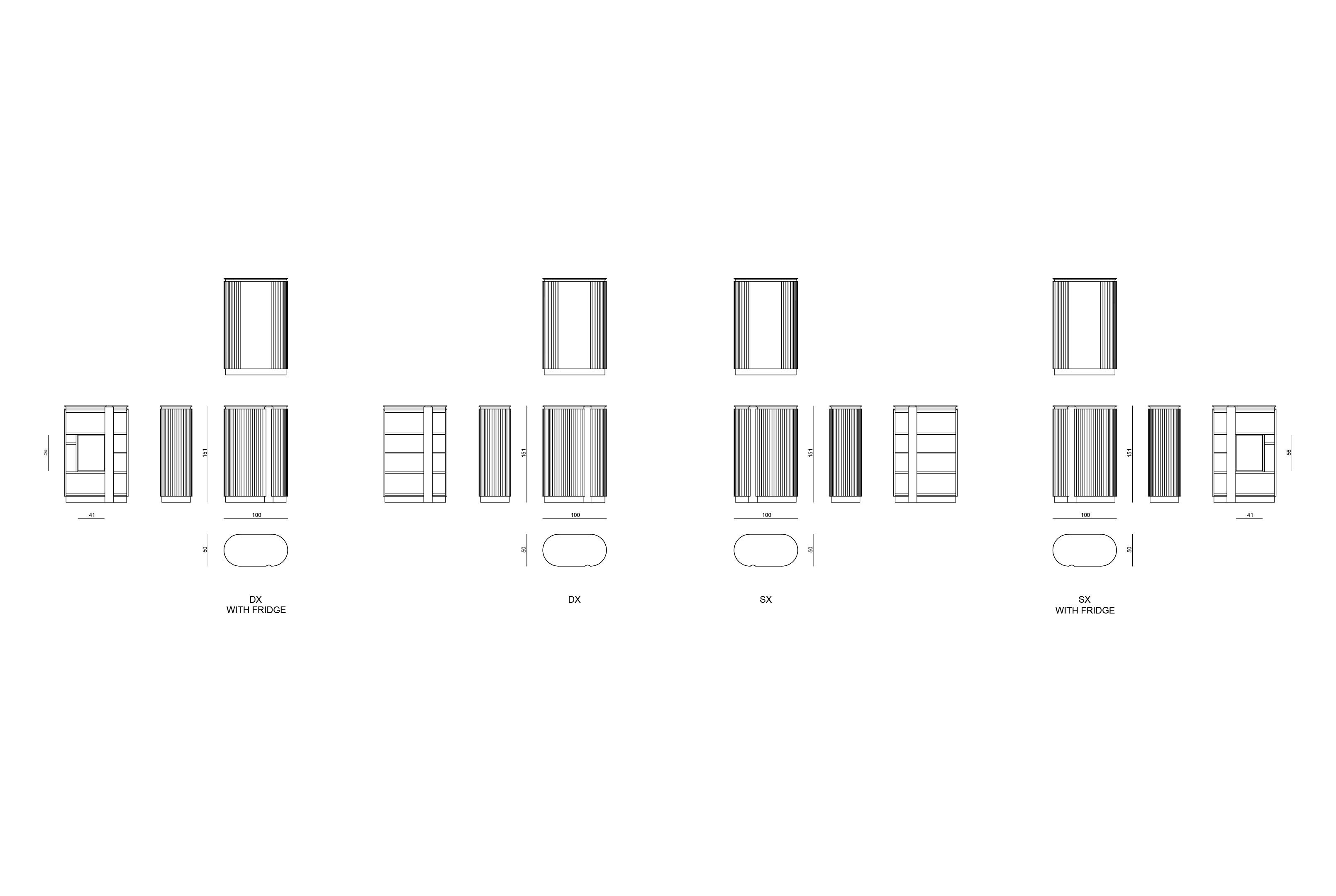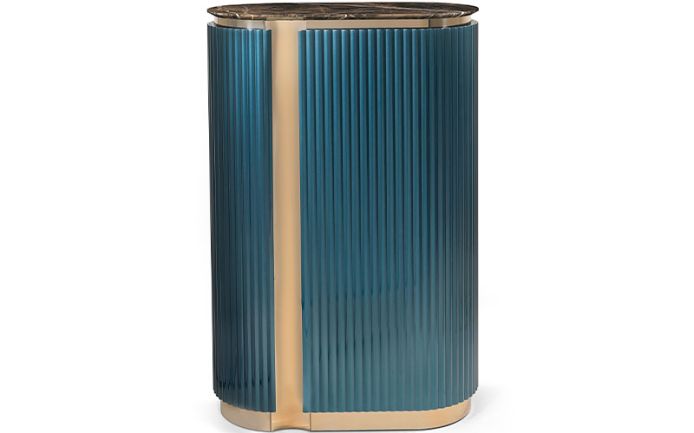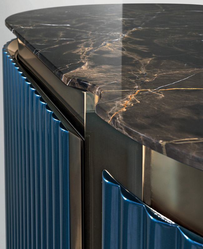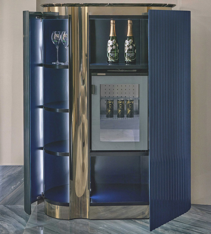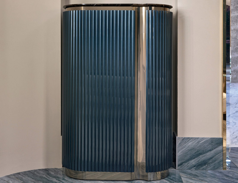High unit with two doors with shaped sides; structure in wood with plinth, under-top profile and supporting pillar covered in polished curved stainless steel, with convex and concave shapes.