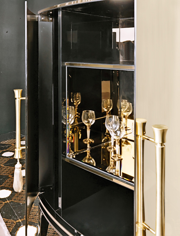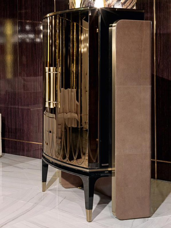 Bar unit in polished lacquered wood with two curved engraved mirror doors (natural - bronzed - smoked) and UV welded angles. Satinized lacquered aluminium handles and leather tassels (optional). Inside shelves in lacquered wood and crystal.