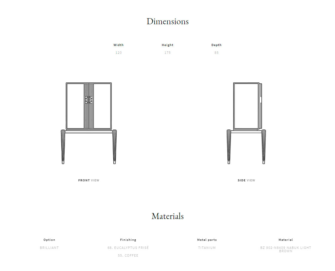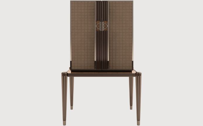 Metal, solid wood and plywood structure. Top available in makassar ebony or eucalyptus frisé veneer. Quilted leather outer body. Beechwood legs with brass details. Internally fitted with 2 drawers, 2 glass shelves; mirror back panel.