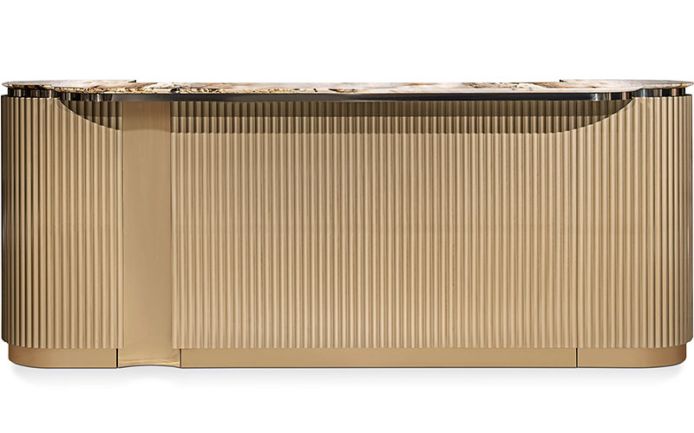 Bar cabinet. Shaped marble top and curved doors, wooden structure consisting of a plinth, a sub-top profile, and a post covered in polished stainless steel curved in concave and convex portions.