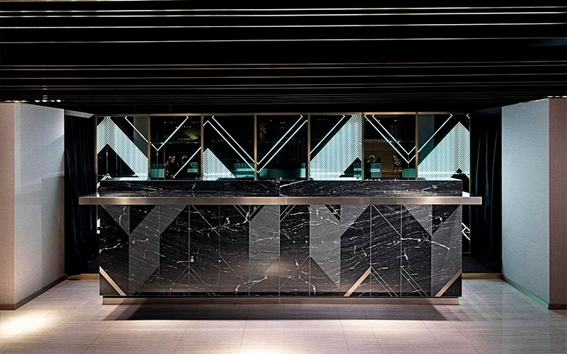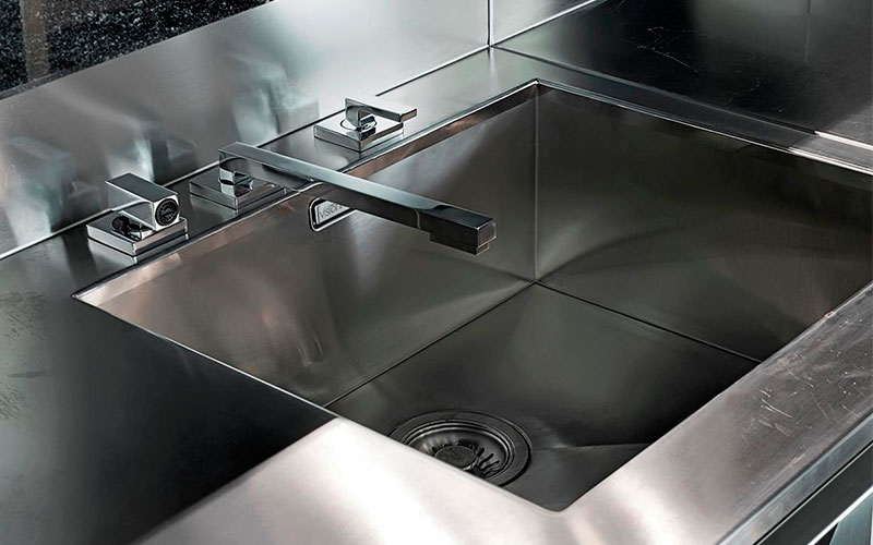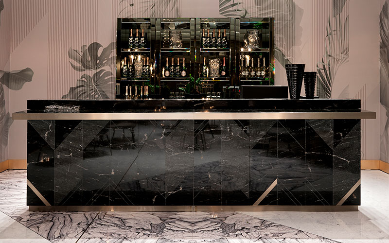 Structure in plywood and MDF, internal compartments in high-resistance ennobled wood, with grooves and base in satinized stainless steel. Front and sides covered in marble with bas-relief engraving and inserts in stainless steel.