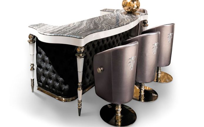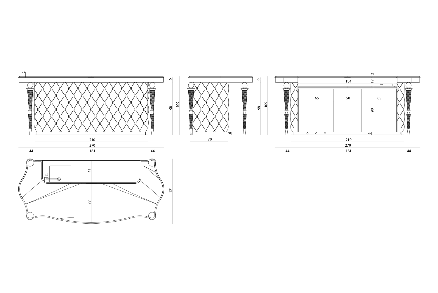Main structure in shaped and curved MDF with capitonne upholstery in leather or fabric. Top in marble and undertop in shaped and curved MDF, in shiny brushed polyester lacquering.