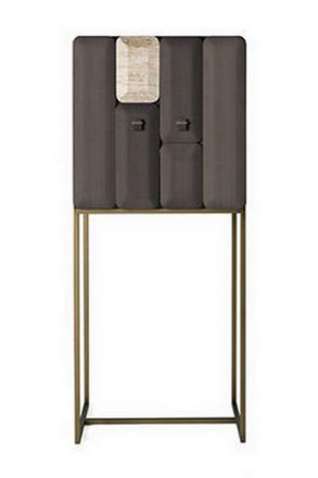 Bar cabinet made of wood, lined with Tay veneer. Additional element of the left door made of Travertino marble. Handles made of black metal and leather. The inner surface is covered with microfiber. Shelves made of glass. The inner wall is made of a natural mirror. LED lighting is provided on the sides. The base is made of metal with a matte bronze finish.