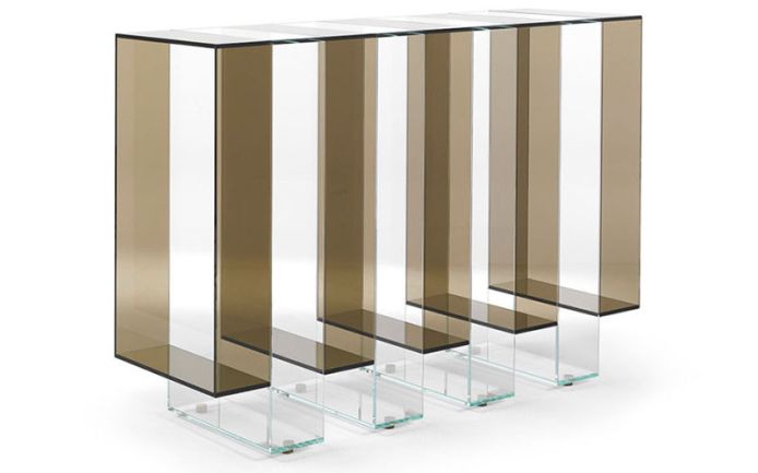 Pure volumes and essential lines: these are the main features of the Jenga console. A composition with a refined design that is expressed in the succession of light and dark glass rectangles, assembled at 45° and joined without showing grafts or joints.