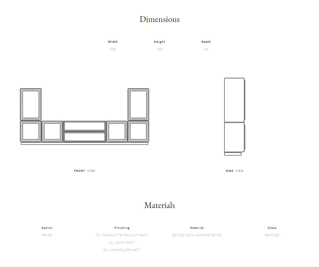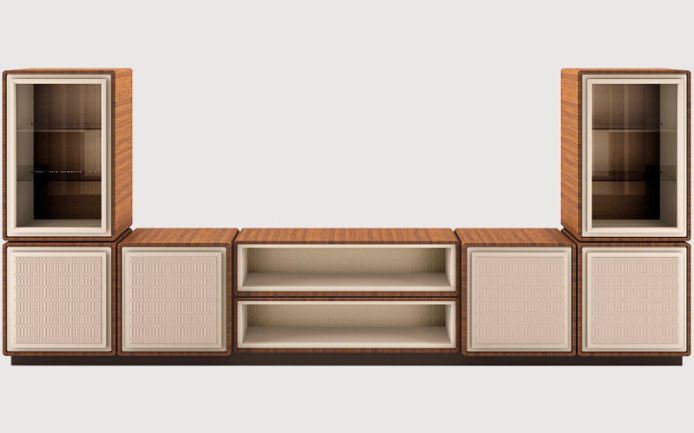Solid wood and plywood structure. Outer structure available in lacquered wood or canaletto walnut veneer. Lacquered wood inner structure. Quilted alcantara back panel. Crystal shelves, bronze colour.