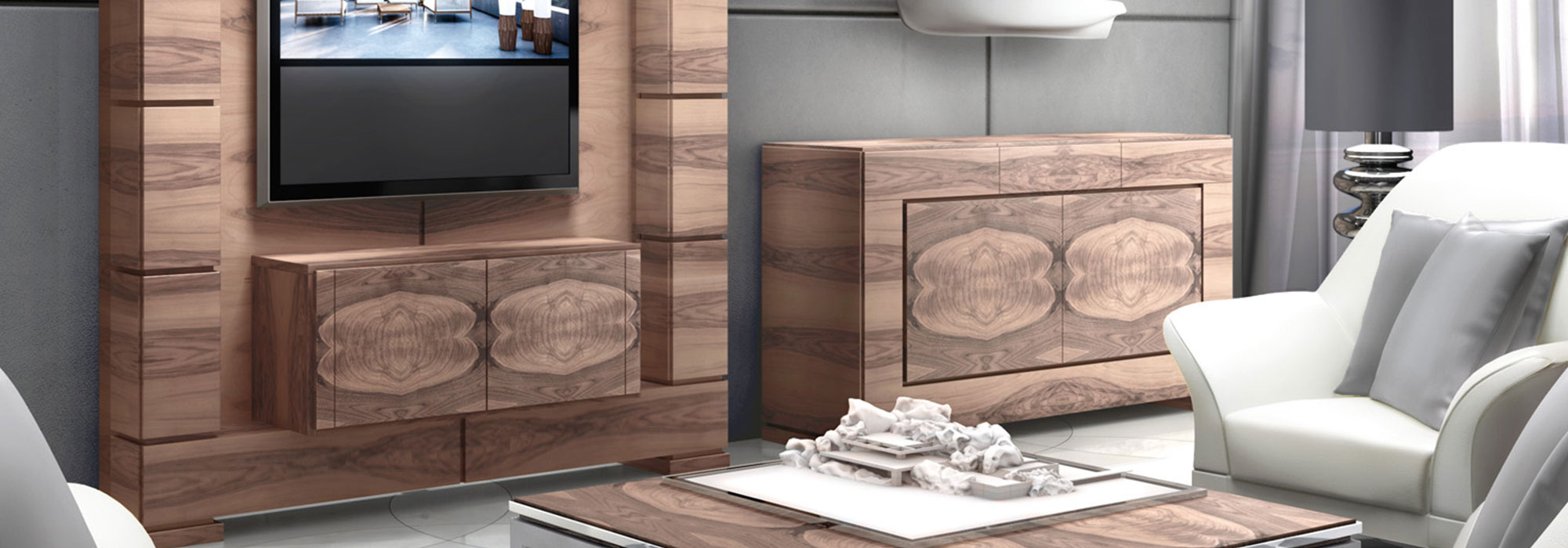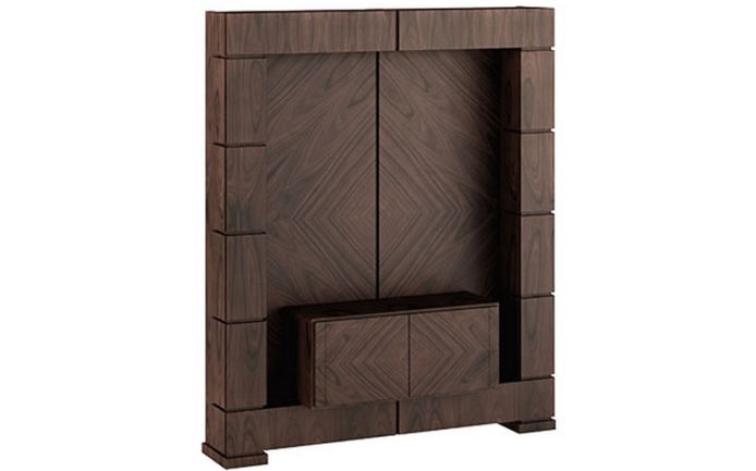 A wenge-colored TV cabinet, a two-door unit with an internal drawer, steel handles with a polished black nickel coating.