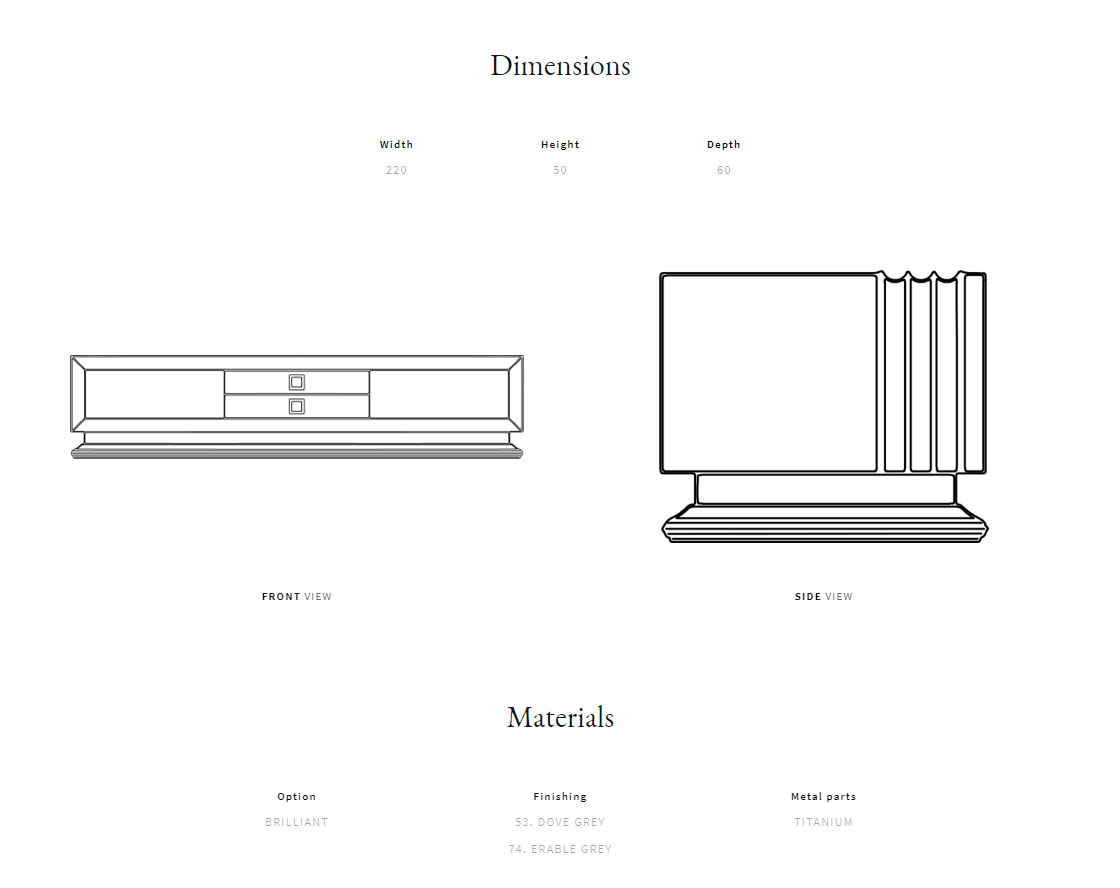 Solid wood and plywood structure. Front profile and drawers available in grey erable, makassar ebony or canaletto walnut veneer. Handles and base details in brass.