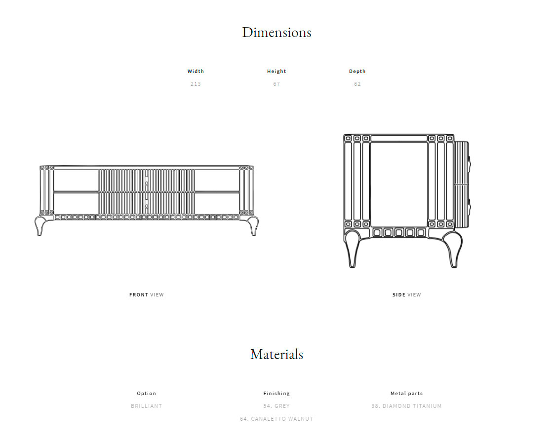 Solid wood and plywood structure. Hand-carved wooden legs. Top available in canaletto walnut veneer or marble. Brass handles.