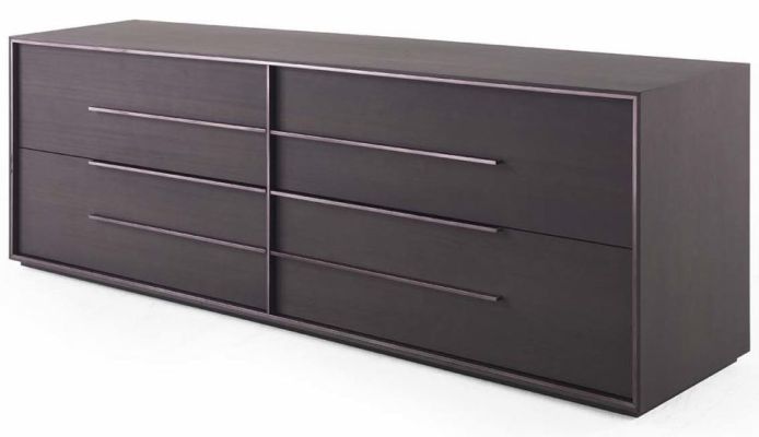 The New Orleans sideboard winks at the music world, paying homage to the jazz capital. Black chrome profiles emphasize the volume of the precious wood construction, creating a design reminiscent of a musical instrument keyboard.