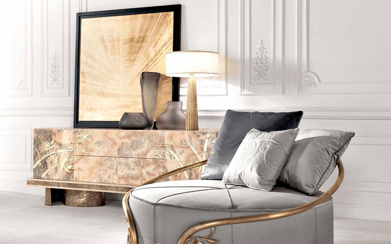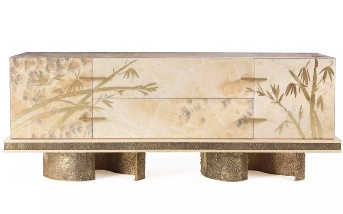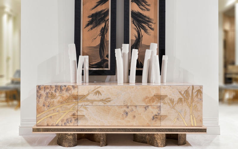 Characterized by sculptural shapes, the pieces of furniture of the Shinto line combine the essence of classic style with a contemporary allure. The pieces are distinguished by an original combination of materials, including natural maple, precious marble and brass casting. The parts in brass castings, with their materic appeal, contrast with shiny components in onyx or marble, enriched with refined decorations in gold leaf. All the pieces are characterized by an important artisanal component: the manufacturing mixes the use of experimental techniques with traditional methods handed down for centuries.