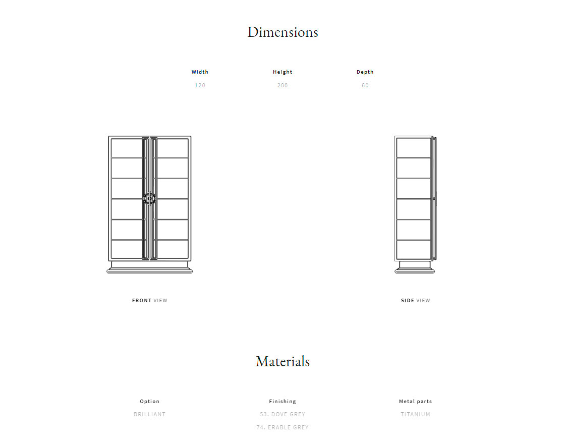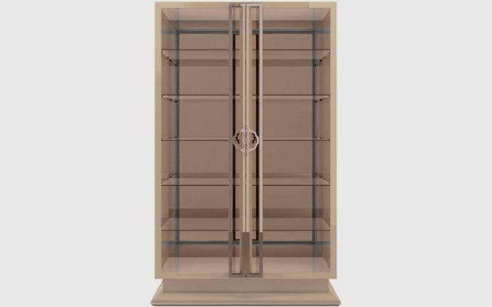 Solid wood and plywood structure. Available in grey erable, makassar ebony or canaletto walnut veneer. Solid wood doors, extrawhite glass. Metal handles. Internally fitted with crystal shelves and bronze mirror back panel.