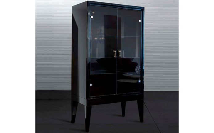 A great opportunity to decorate the interior of the kitchen or dining room with a harmonious showcase. A showcase with a body made of solid wood with a shade of dark wenge on legs, a cabinet facade made of two hinged glass doors without handles with smooth opening, the interior space is divided into three shelves. When custom-made, the overall dimensions can be adjusted.