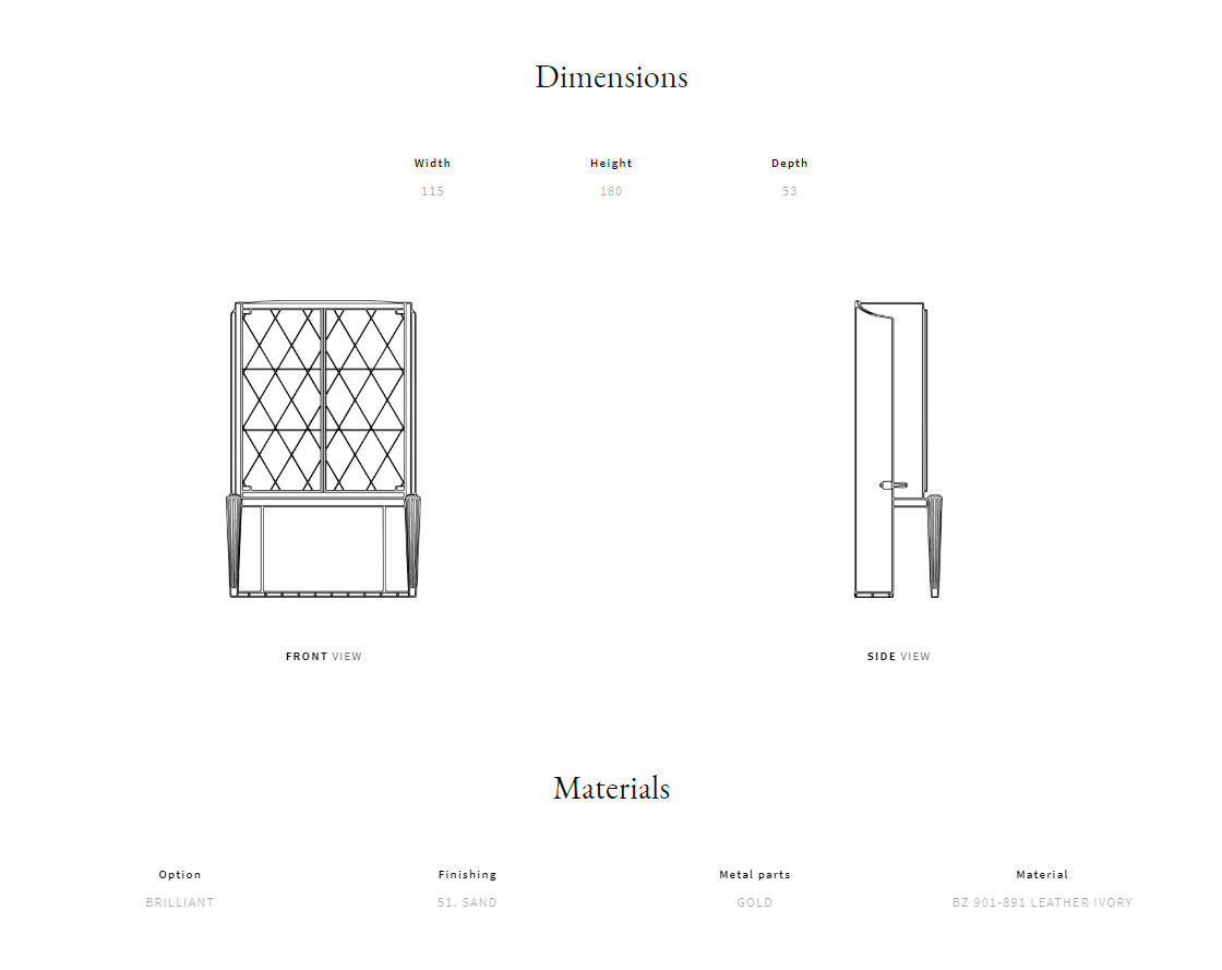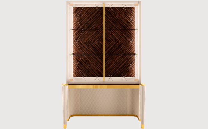 Curved plywood structure, covered in leather. Beechwood legs with metal details. Carved glass doors; glass shelves. Makassar ebony veneer back panel and LED lighting. Metal handles.