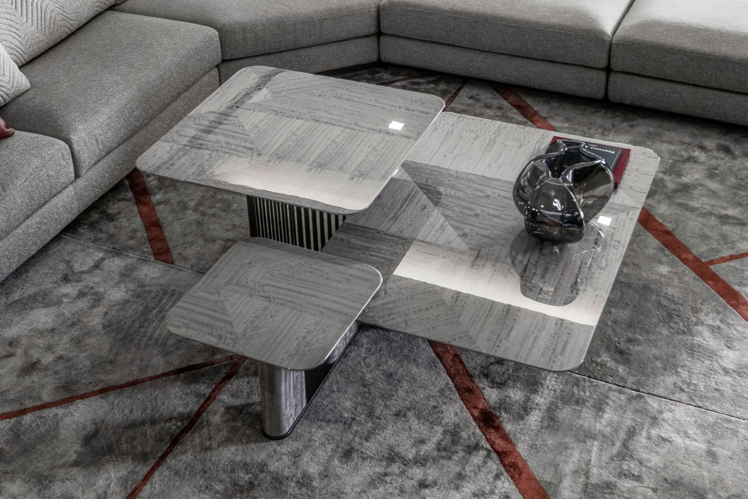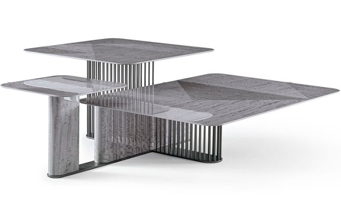 Triple cocktail table with top in inlaid Tasmanian curly Eucaliptus veneer with high gloss polyester finish. Base in combination of satin grey nickel stainless steel and Tasmanian curly Eucaliptus veneer with high gloss polyester finish.