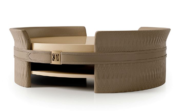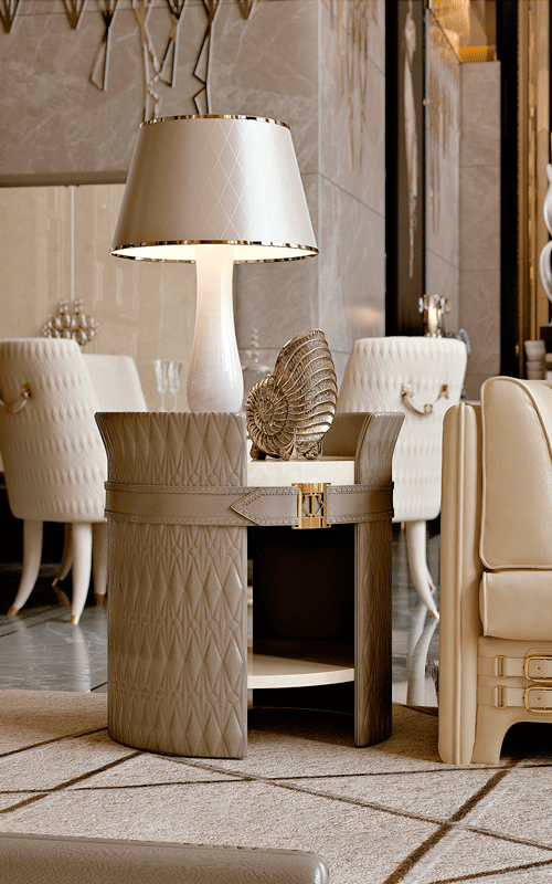 The round tables of the Numero Tre collection are available in various sizes and heights, they are made with a wooden structure covered with quilted leather and with wood elements in a glossy lacquer finish, their countertops can be personalized with precious marble. The round tables of the Numero Tre collection are available in various finishes according to the samples.