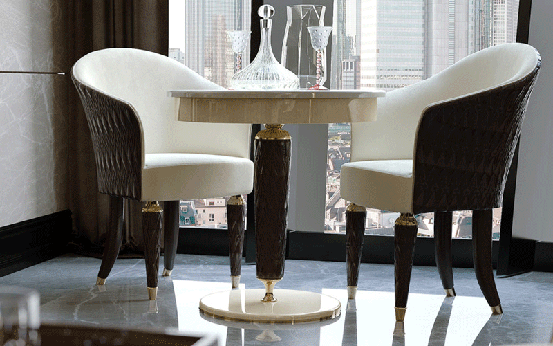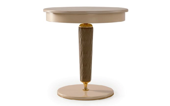 The coffee table of the Numero Tre collection is built on a central column covered with quilted leather, and a base made of wood in a glossy lacquer finish balances the entire structure. The table top can be of a choice: marble or wood, finished with glossy varnish. The coffee table of the Numero Tre collection is available in various finishes according to the samples.