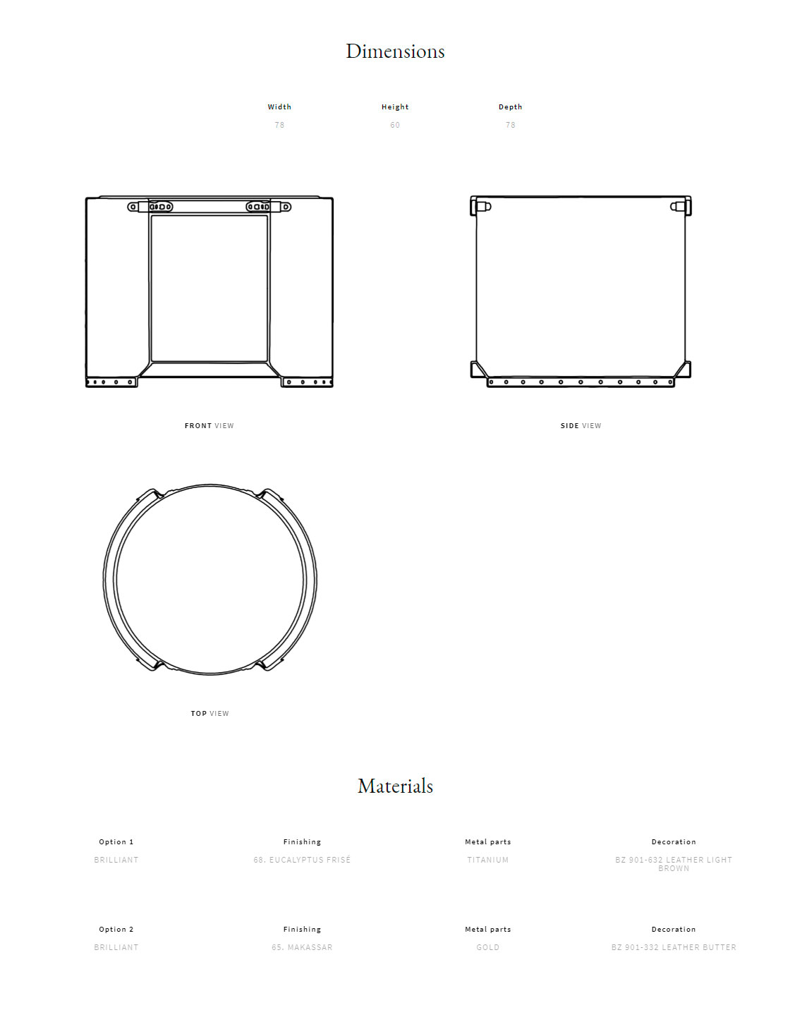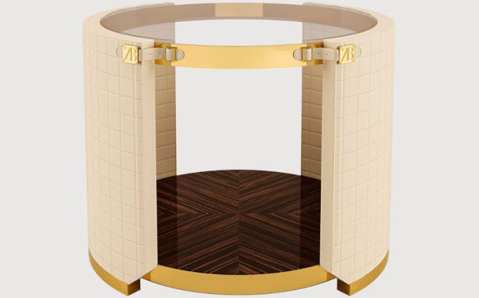 Metal frame. Quilted leather legs. Base available in makassar ebony or eucalyptus frisé veneer. Glass top.