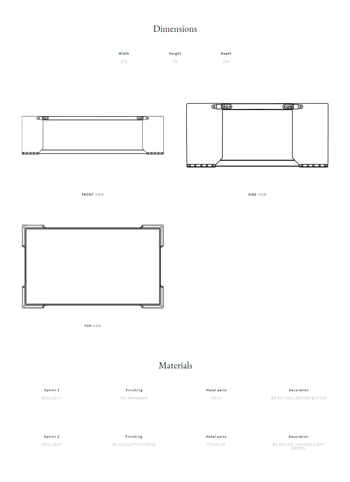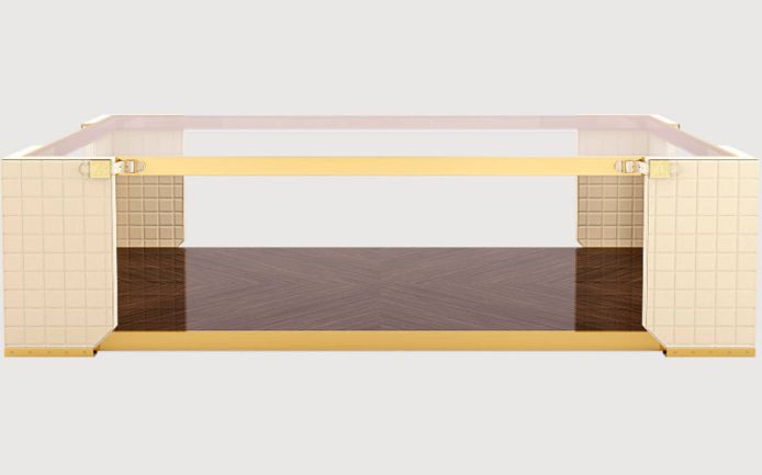 Metal frame. Quilted leather legs. Base available in makassar ebony or eucalyptus frisé veneer. Glass top.