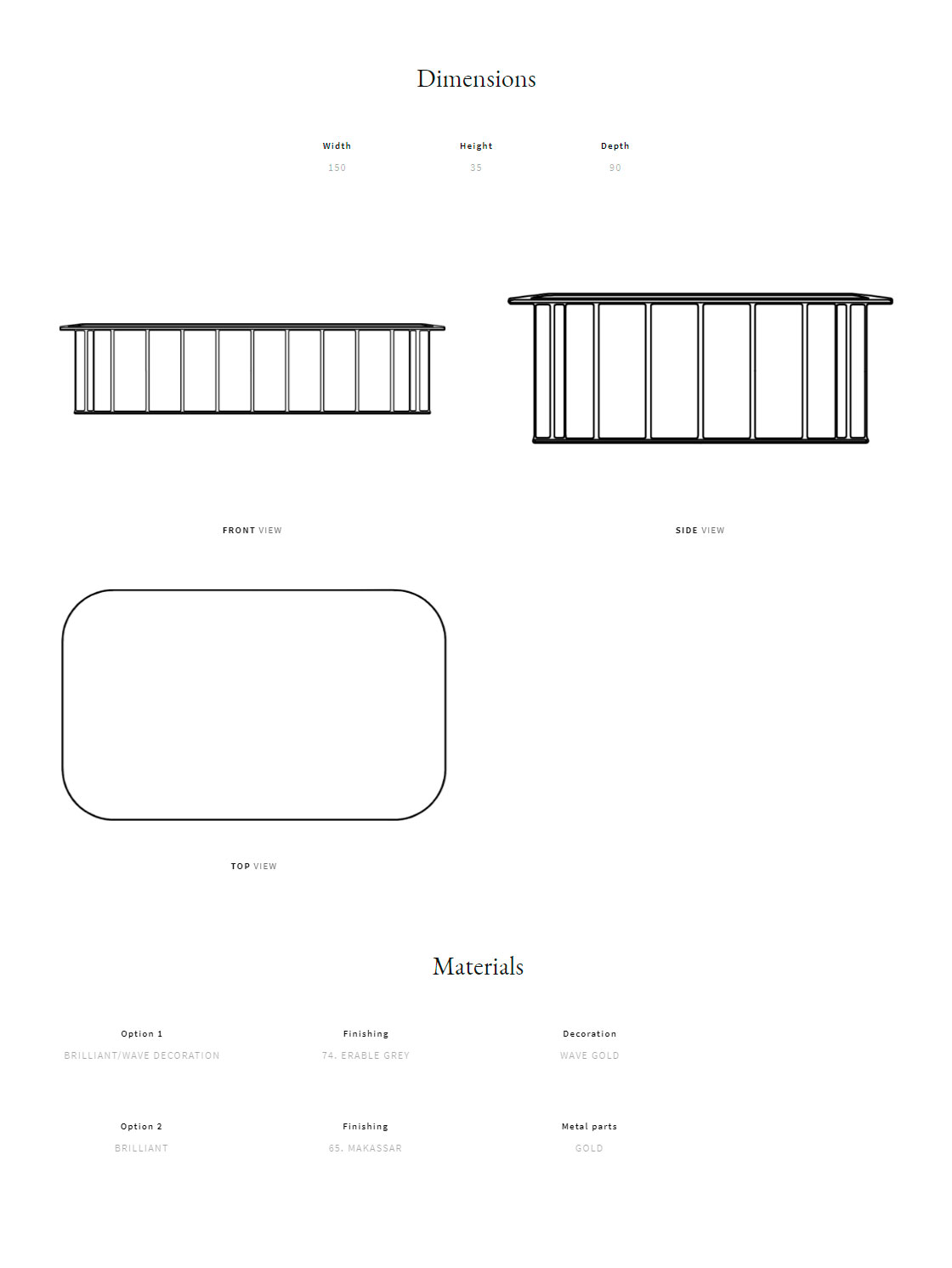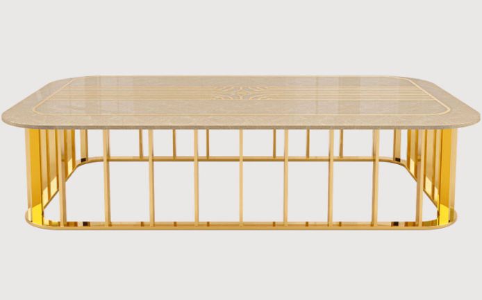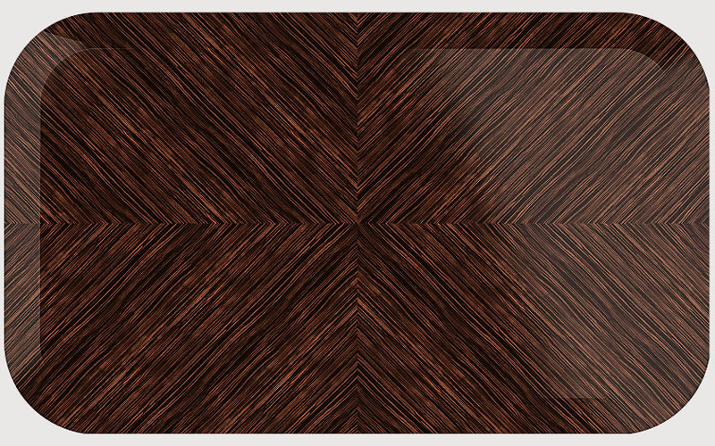 Gold plated metal base; top available in lacquered wood, in wood veneer (makassar ebony, canaletto walnut, grey erable), wood veneer with “Wave” decoration or marble.