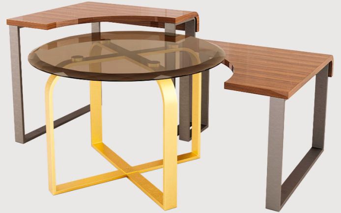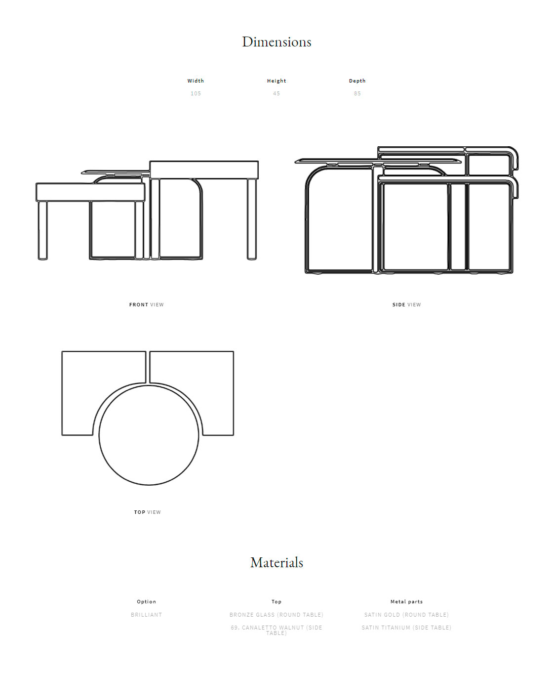 Metal frame, satin finishing. Bronze glass top (diamond beveled edge) for round table; canaletto walnut wooden top for side tables.