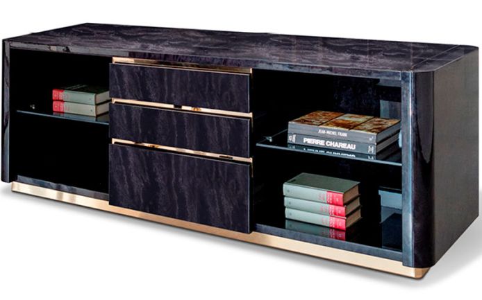 Return for desk on wheels in Black Bubinga burl veneer with high gloss polyester finish.Top in tempered black glass.3 full extension drawers with bottom part in velvet fabric.2 open sides with 1 glass shelf. Base and handles in light gold chrome stainless steel.