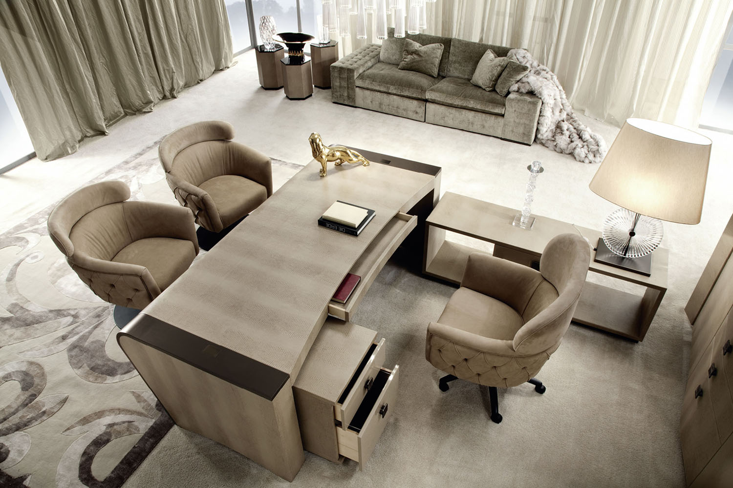 Drawers return on wheels with 3 drawers fronts in high gloss polyester lacquer, top, base and sides panels in armadillo printed leather 3 full extensions drawers with bottom in armadillo printed leather. Details and handles in bronzed brass.