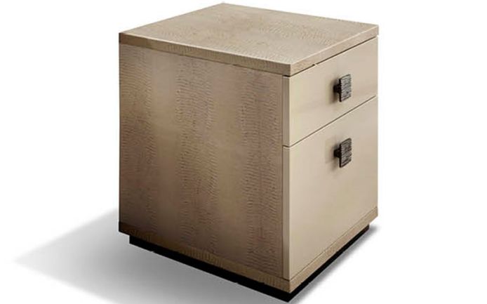 File cabinet on wheels with 2 drawers fronts in high gloss polyester lacquer, top, base and sides panels in armadillo printed leather 1 full extension drawer + 1 full extension file drawer with bottom in armadillo printed leather. Details and handles in bronzed brass.