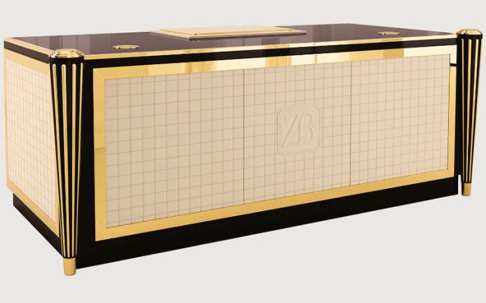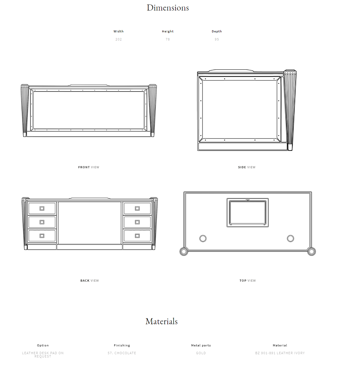 Solid wood, plywood and MDF frame. Lacquered wooden top. Quilted leather outer body and drawers, with metal details. Wooden and brass legs. Available with one or two cable organizers. Leather desk pad on request.