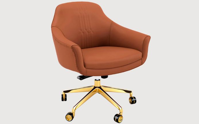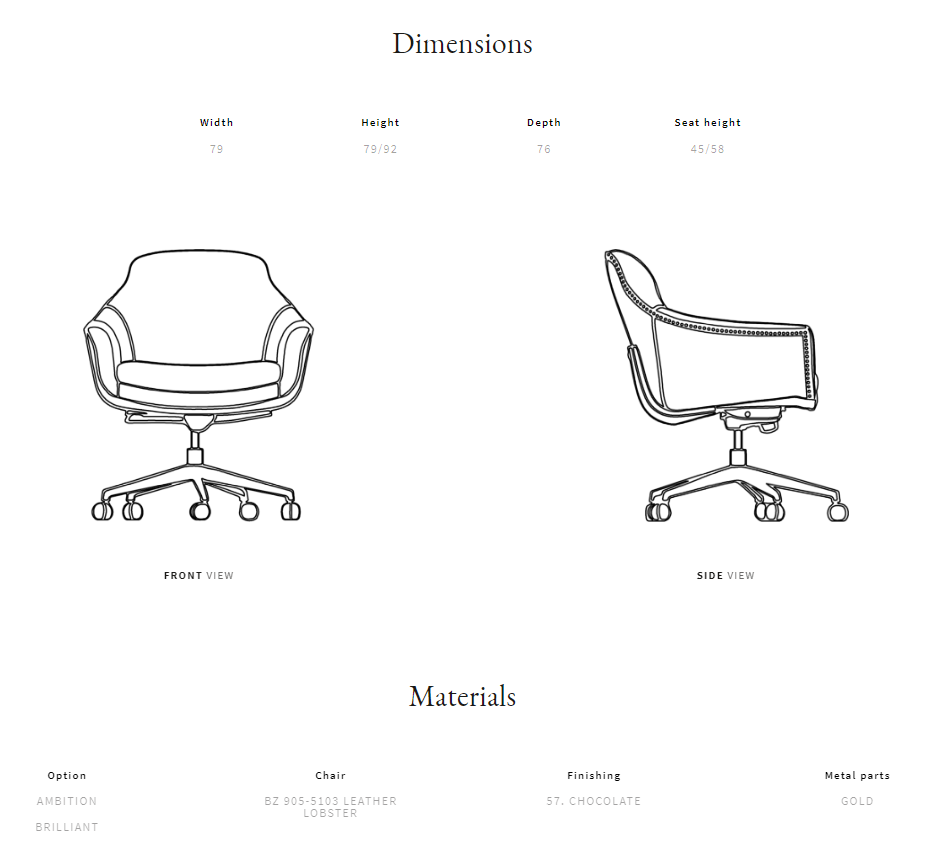 Solid wood frame. Quilted leather backrest and outer body. Finished with leather covered nails. Multiple densities polyurethane foam padding. Lacquered wooden shell. 5 feet metal base with "Design" wheels, adjustable height.