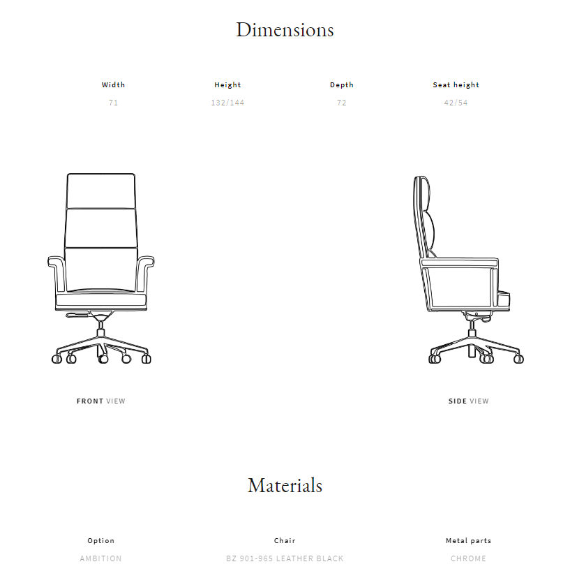 Solid wood and plywood frame. Multiple densities polyurethane foam padding. 5 feet metal base with "Design" wheels, adjustable height.