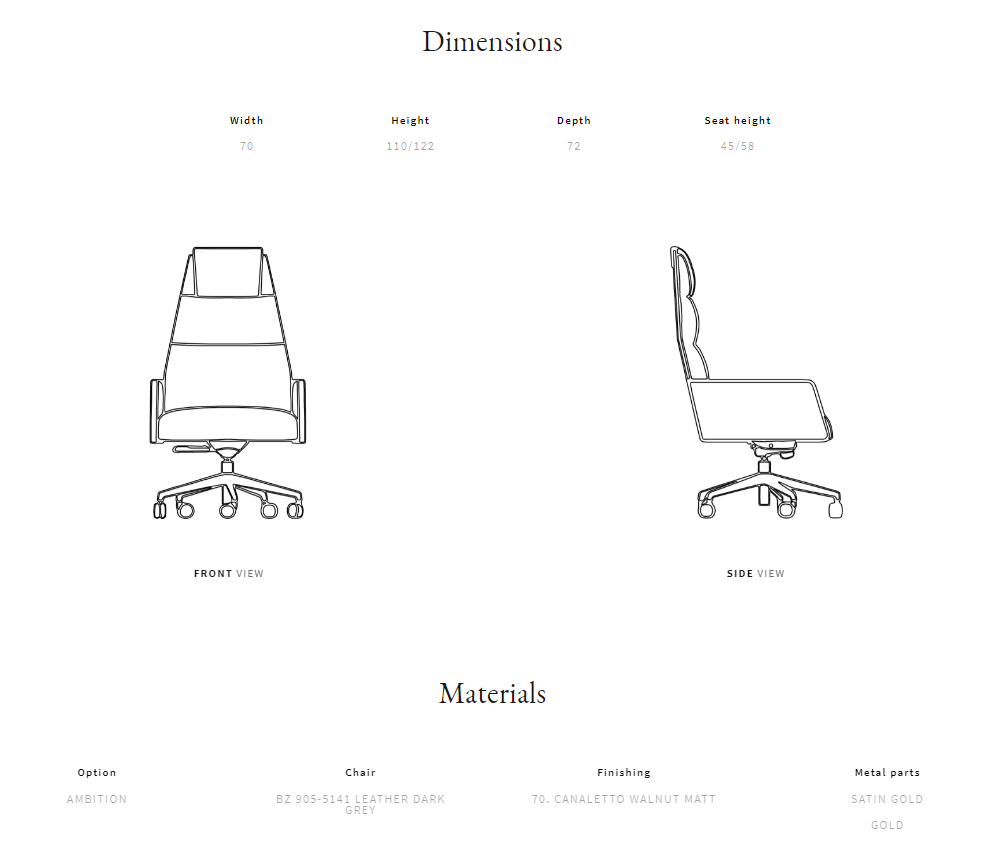 Solid wood frame. Quilted leather inner body and armrests. Canaletto walnut wooden veneer outer body. Satin metal armrests frame. Multiple densities polyurethane foam padding. 5 feet metal base with "Design" wheels, adjustable height.